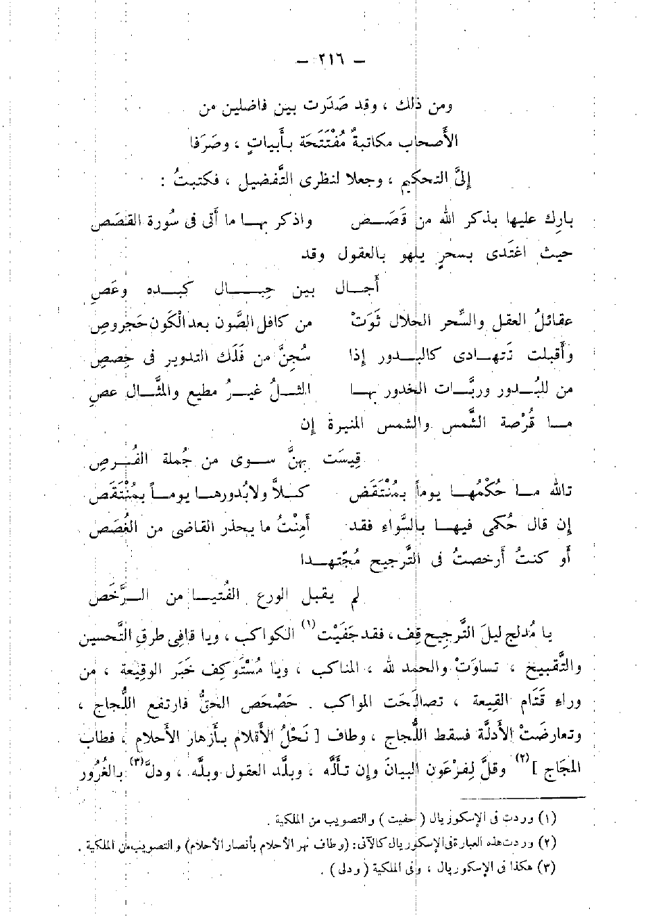 يَا مُدْلِج ليل التَّرْجِيح قف، فقد جفيت الْكَوَاكِب، وَيَا قافي طرق التحسين والتقبيح، تَسَاوَت وَالْحَمْد لله، المناكب، وَيَا مستوكف خبر الوقيعة، من وَرَاء قتام القيعة، تصالحت المواكب. حصحص الْحق فارتفع اللجاج، وتعارضت الْأَدِلَّة فَسقط اللجاج، وَطَاف [نحل الأقلام بأزهار الأحلام، فطاب المجاج] وَقل لفرعون الْبَيَان وَإِن تأله، وبلد الْعُقُول وبله، وَدلّ بالغرور