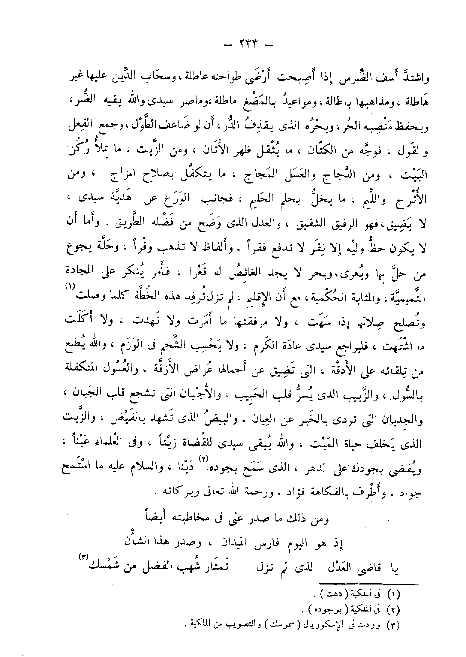 وَاشْتَدَّ أَسف الضرس إِذا أَصبَحت أرْضى طواحنه عاطلة، وسحاب الدّين عَلَيْهَا غير هاطلة، ومذاهبها بَاطِلَة، ومواعيد بالمضغ ماطلة، وماضر سَيِّدي وَالله يَقِيه الضّر، ويحفظ منصبه الْحر، وبحره الَّذِي يقذف الدّرّ، أَن لَو ضَاعَت الطول، وَجمع الْفِعْل وَالْقَوْل، فَوجه من الْكَتَّان، مَا يثقل ظهر الأتان، وَمن الزَّيْت، مَا يمْلَأ ركن الْبَيْت، وَمن الدَّجَاج وَالْعَسَل المجاج، مَا يتكفل بصلاح المزاج، وَمن الأترج والليم، مَا يخل بحلم الْحَلِيم، فجانب الْوَرع عَن هَدِيَّة سَيِّدي، لَا يضيق، فَهُوَ الرفيق الشَّقِيق، وَالْعدْل الَّذِي وضح من فَضله الطَّرِيق. وَأما أَن لَا يكون حَظّ وليه إِلَّا نقر لَا تدفع فقرا، وألفاظ لَا تذْهب وقرا، وحلة يجوع من حل بهَا ويعري، وبحر لَا يجد الغائص لَهُ قعرا، فَأمر يُنكر على المجادة التميمية، والمثابة الْحكمِيَّة، مَعَ أَن الإقليم، لم تزل ترفد هَذِه الخطة كلما وصلت وَتصْلح صلَاتهَا إِذا سهت، وَلَا مرفقتها مَا أمرت وَلَا نهدت، وَلَا أكلت مَا اشتهت، فَليُرَاجع سَيِّدي عَادَة الْكَرم، وَلَا يحْسب الشَّحْم فِي الورم، وَالله يطلع من تلقائه على الأدقة، الَّتِي تضيق عَن أحمالها عراض الْأَزِقَّة، والعسول المتكفلة بالسول، وَالزَّبِيب الَّذِي يسر قلب الحبيب، والأجبان الَّتِي تشجع قلب الجبان، والجدبان الَّتِي تردي بالْخبر عَن العيان، وَالْبيض الَّذِي تشهد بالفيض، وَالزَّيْت الَّذِي يخلف حَيَاة الْمَيِّت، وَالله يبقي سَيِّدي للقضاة زيتا، وَفِي الْعلمَاء عينا، ويفضي بجودك على الدَّهْر، الَّذِي سمح بجوده دينا، وَالسَّلَام عَلَيْهِ مَا استمح جواد، وأطرف بالفكاهة فؤاد، وَرَحْمَة الله تَعَالَى وَبَرَكَاته.