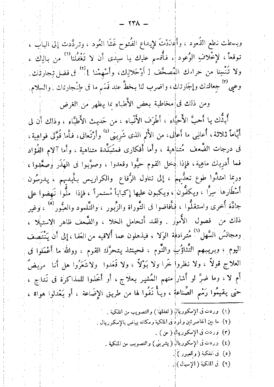 أبثك يَا أحب الأحباء، أطرف الأنباء، من حَدِيث الْأَطِبَّاء، وَذَلِكَ أَن لي أَيَّامًا ثَلَاثَة، أعاني مَا أعاني، من الْأَلَم الَّذِي شريني وأرتعاني، فَأَما قوتي فواهية، فِي دَرَجَات الضعْف متناهية، وَأما أفكاري فمتبلدة متناهية، وَأما آلام الْفُؤَاد فَمَا أدريك مَاهِيَّة، فَإِذا دخل الْقَوْم حيو وقعدوا، وصوبوا فِي الهذر وصعدوا، وَرُبمَا امتدوا طوع تعديهم، إِلَى تنَاول الرّقاع والكراريس بِأَيْدِيهِم، يدرسون أسطارها سرا، ويكفون، ويكبون عَلَيْهَا إكبابا مستمرا، فَإِذا ملوا نهضوا على جادة أُخْرَى واستقلوا، فأفاضوا فِي التَّوْرَاة وَالزَّبُور، والتلمود والعبور، وَغير ذَلِك من فُصُول الْأُمُور. وَلَقَد أتحامل الخلا، والضعف ظَاهر الاستيلا، ومجالس السهل مترادفة الولا، فيذهلون عَمَّا ألاقيه من العفا، إِلَى أَن ينتصف الْيَوْم، وبريبهم التثاؤب وَالنَّوْم، فَحِينَئِذٍ يَتَحَرَّك الْقَوْم، وَوَاللَّه مَا أعملوا فِي العلاج قولا، وَلَا نظرُوا خرا وَلَا بولا، وَلَا قعدوا وَلَا شعروا هَل أَنا مَرِيض أم لَا، وَمَا ضرّ لَو أَشَارَ مِنْهُم المشير بعلاج، أَو أخذُوا للمذاكرة فِي نتاج، حَتَّى يقيموا رسم الصِّنَاعَة، ويأنفوا لَهَا من طَرِيق الإضاعة، أَو يعدلُوا هَوَاء،