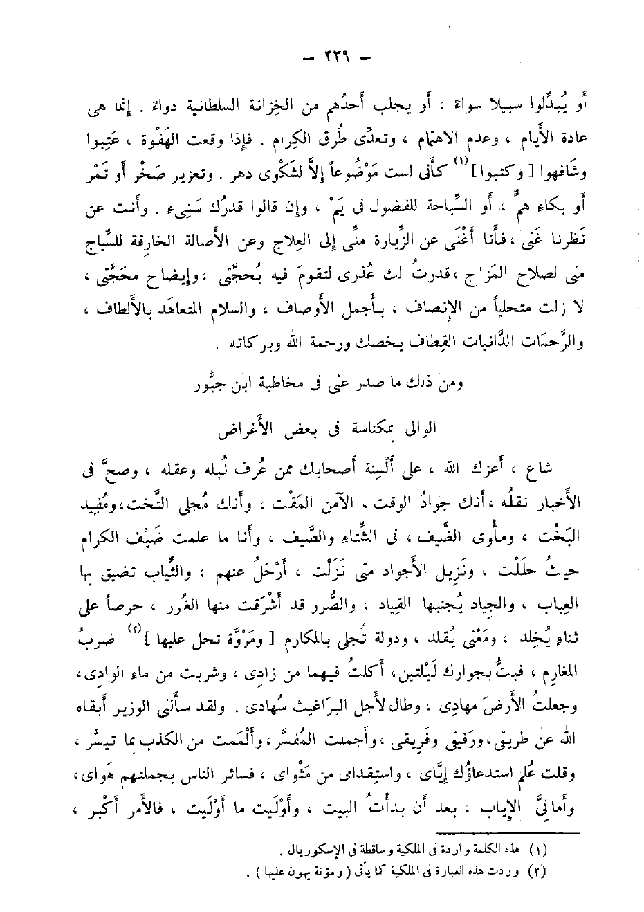 أَو يبدلوا سَبِيلا سَوَاء، أَو يجلب أحدهم من الخزانة السُّلْطَانِيَّة دَوَاء. إِنَّمَا هِيَ عَادَة الْأَيَّام، وَعدم الاهتمام، وتعدي طرق الْكِرَام. فَإِذا وَقعت الهفوة، عتبوا وشافهوا [وَكَتَبُوا] كَأَنِّي لست مَوْضُوعا إِلَّا لشكوى دهر. وتعزير صَخْر أَو تمر أَو بكاء هم، أَو السباحة للفضول فِي يم، وَإِن قَالُوا قدرك سنىء. وَأَنت عَن نَظرنَا غنى، فَأَنا عَن الزِّيَارَة مني إِلَى العلاج وَعَن الْأَصَالَة الخارقة للسياج مني لصلاح المزاج، قدرت لَك عُذْري لتقوم فِيهِ بحجتي، وإيضاح محجتي، لَا زلت متحليا من الْإِنْصَاف، بأجمل الْأَوْصَاف، وَالسَّلَام المتعاهد بالألطاف، والرحمات الدانيات القطاف يخصك وَرَحْمَة الله وَبَرَكَاته.
