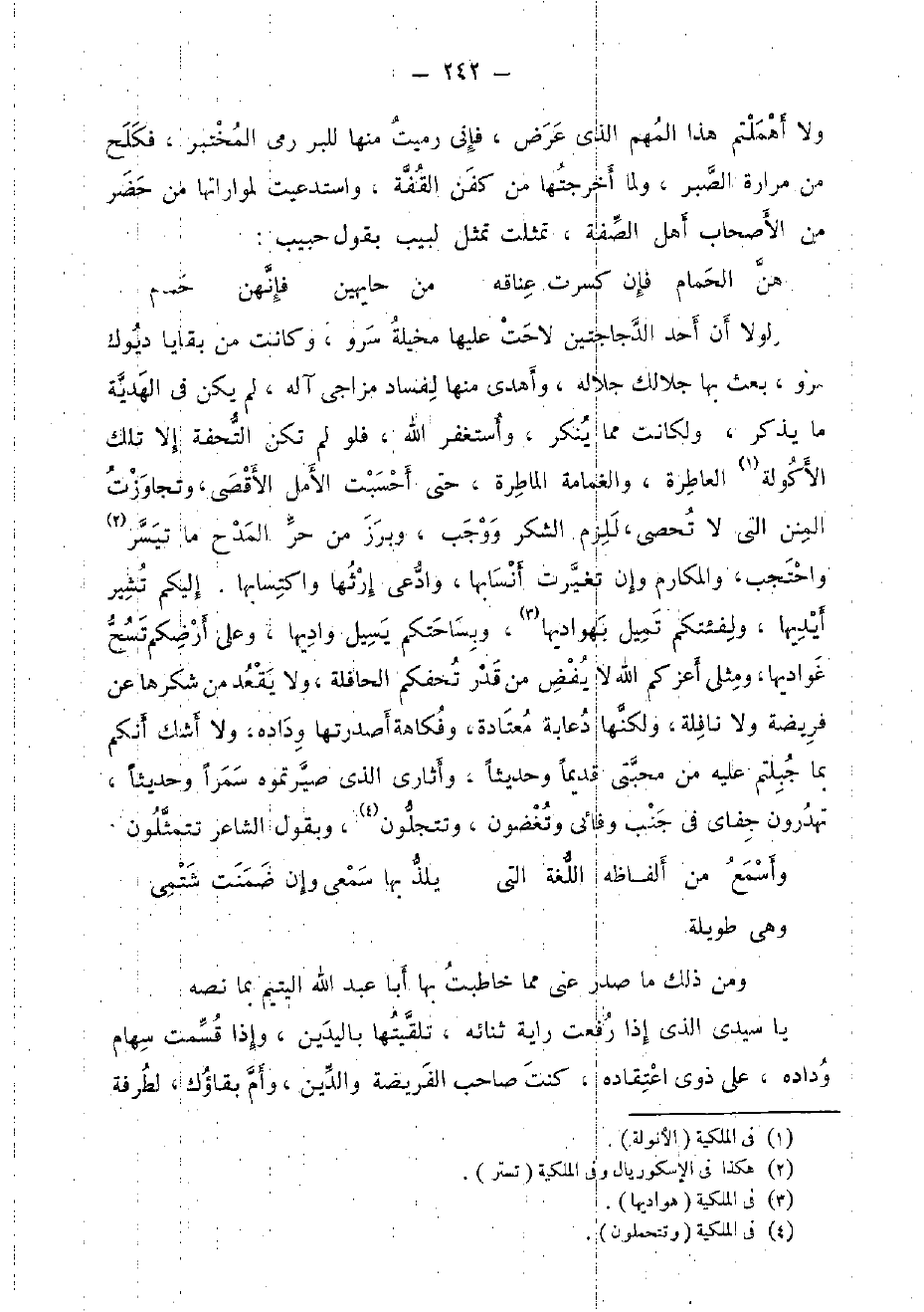 وَلَوْلَا أَن أحد الدجاجتين لاحت عَلَيْهَا مخيلة سرو، وَكَانَت من بقايا ديوك مرو، بعث بهَا جلالك جَلَاله، وَأهْدى مِنْهَا لفساد مزاجي آله، لم يكن فِي الْهَدِيَّة مَا يذكر، ولكانت مِمَّا يُنكر، وَأَسْتَغْفِر الله، فَلَو لم تكن التُّحْفَة إِلَّا تِلْكَ الأكولة العاطرة، والغمامة الماطرة، حَتَّى أحسبت الأمل الْأَقْصَى، وتجاوزت المنن الَّتِي لَا تحصى، للَزِمَ الشُّكْر وَوَجَب، وبرز من حر الْمَدْح مَا تيَسّر واحتجب، والمكارم وَإِن تَغَيَّرت أنسابها، وَادّعى إرثها واكتسابها. إِلَيْكُم تُشِير أيديها، ولفئتكم تميل بهواديها، وبساحتكم يسيل واديها، وعَلى أَرْضكُم تسح غواديها، ومثلى أعزكم الله لَا يفض من قدر تحفكم الحافلة، وَلَا يقْعد من شكرها عَن فَرِيضَة وَلَا نَافِلَة، وَلكنهَا دعابة مُعْتَادَة، وفكاهة أصدرتها وداده، وَلَا أَشك أَنكُمْ بِمَا جبلتم عَلَيْهِ من محبتي قَدِيما وحديثا، وأثاري الَّذِي صيرتموه سمرا وحديثا، تهدرون جفاي فِي جنب وفائي وتغضون، وتتجلون، وَبقول الشَّاعِر تتمثلون