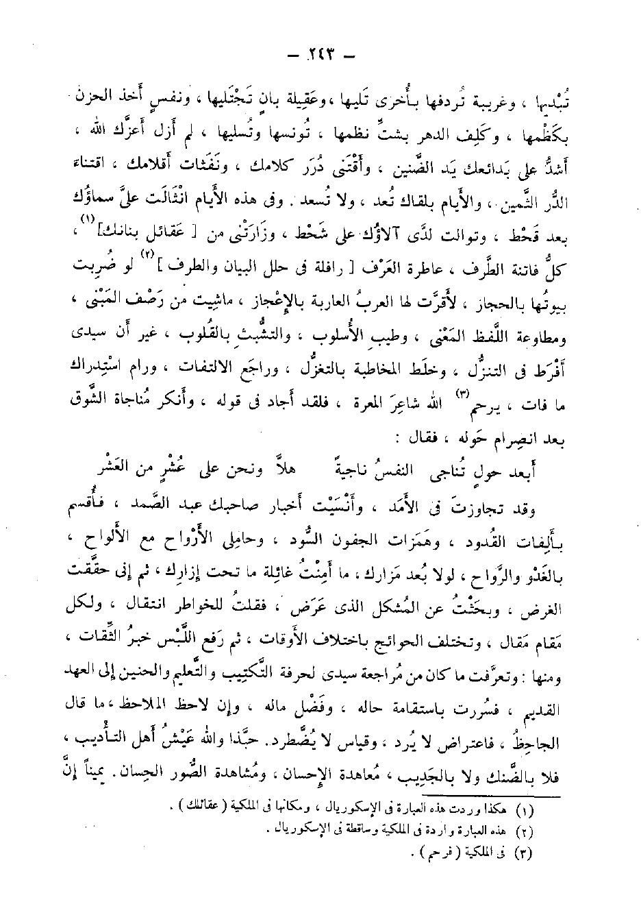 تبديها، وغريبة تردفها بِأُخْرَى تَلِيهَا، وعقيلة بَان تجتليها، وَنَفس أَخذ الْحزن بكظمها، وكلف الدَّهْر بِشَتٍّ نظمها، تونسها وتسليها، لم أزل أعزّك الله، أَشد على بدائعك يَد الضنين، وأقتني دُرَر كلامك، ونفثات أقلامك، اقتناء الدّرّ الثمين، وَالْأَيَّام بلقاك تعد، وَلَا تسعد. وَفِي هَذِه الْأَيَّام انثالت على سماؤك بعد قحط، وتوالت لَدَى آلاؤك على شحط، وزارتني من [عقائل بنانك] ، كل فاتنة الطّرف، عاطرة الْعرف [رافلة فِي حلل الْبَيَان والطرف] لَو ضربت بيوتها بالحجاز، لأقرت لَهَا الْعَرَب العاربة بالإعجاز، ماشيت من رصف المبنى، ومطاوعة اللَّفْظ الْمَعْنى، وَطيب الأسلوب، والتشبث بالقلوب، غير أَن سَيِّدي أفرط فِي التنزل، وخلط المخاطبة بالتغزل، وراجع الِالْتِفَات، ورام اسْتِدْرَاك مَا فَاتَ، يرحم الله شَاعِر المعرة، فَلَقَد أَجَاد فِي قَوْله، وَأنكر مُنَاجَاة الشوق بعد انصرام حوله، فَقَالَ: