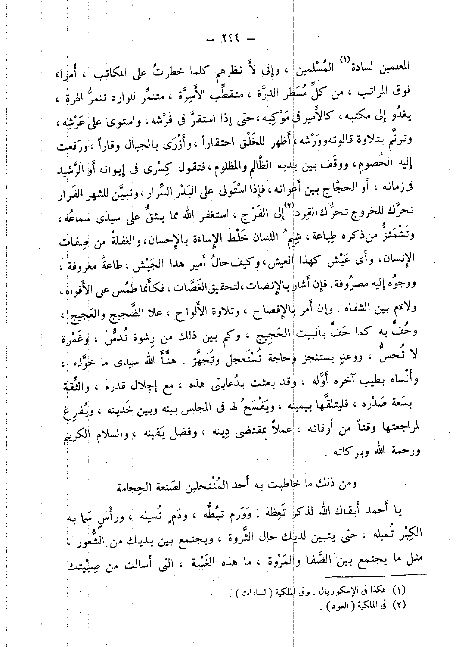 المعلمين لسادة الْمُسلمين، وَإِنِّي لأنظرهم كلما خطرت على الْمكَاتب، أُمَرَاء فَوق الْمَرَاتِب، من كل مسطر الدرة، متقطب الأسرة، متنمر للوارد تنمر الْهِرَّة، يَغْدُو إِلَى مكتبه، كالأمير فِي موكبه، حَتَّى إِذا اسْتَقر فِي فرشه، واستوى على عَرْشه، وترنم بِتِلَاوَة قالوته وورشه، أظهر لِلْخلقِ احتقارا، وأزرى بالجبال وقارا، وَرفعت إِلَيْهِ الْخُصُوم، ووقف بَين يَدَيْهِ الظَّالِم والمظلوم، فَتَقول كسْرَى فِي إيوانه أَو الرشيد فِي زَمَانه، أَو الْحجَّاج بَين أعوانه، فَإِذا استولى على الْبَدْر السرَار، وَتبين للشهر الْفِرَار تحرّك لِلْخُرُوجِ تحرّك القرد إِلَى الْفرج، اسْتغْفر الله مِمَّا يشق على سَيِّدي سَمَاعه، وتشمئز من ذكره طباعة، شيم اللِّسَان خلط الْإِسَاءَة بِالْإِحْسَانِ، والغفلة من صِفَات الْإِنْسَان، وَأي عَيْش كَهَذا الْعَيْش، وَكَيف حَال أَمِير هَذَا الْجَيْش، طَاعَة مَعْرُوفَة، ووجوه إِلَيْهِ مصروفة. فَإِن أَشَارَ بالإنصات، لتحقيق الغصات، فَكَأَنَّمَا طمس على الأفواه، ولاءم بَين الشفاه. وَإِن أَمر بالإفصاح، وتلاوة الألواح، علا الضجيج والعجيج، وحف بِهِ كَمَا حف بِالْبَيْتِ الحجيج، وَكم بَين ذَلِك من رشوة تدس، وغمرة لَا تحس، ووعد يستنجز وحاجة تستعجل وتجهز. هَنأ الله سَيِّدي مَا خوله، وأنساه بِطيب آخِره أَوله، وَقد بعثت بدعابتي هَذِه، مَعَ إجلال قدره، والثقة بسعة صَدره، فليتلقها بِيَمِينِهِ، ويفسح لَهَا فِي الْمجْلس بَينه وَبَين خدينه، ويفرغ لمراجعتها وقتا من أوقاته، عملا بِمُقْتَضى دينه، وَفضل يقينه، وَالسَّلَام الْكَرِيم وَرَحْمَة الله وَبَرَكَاته.