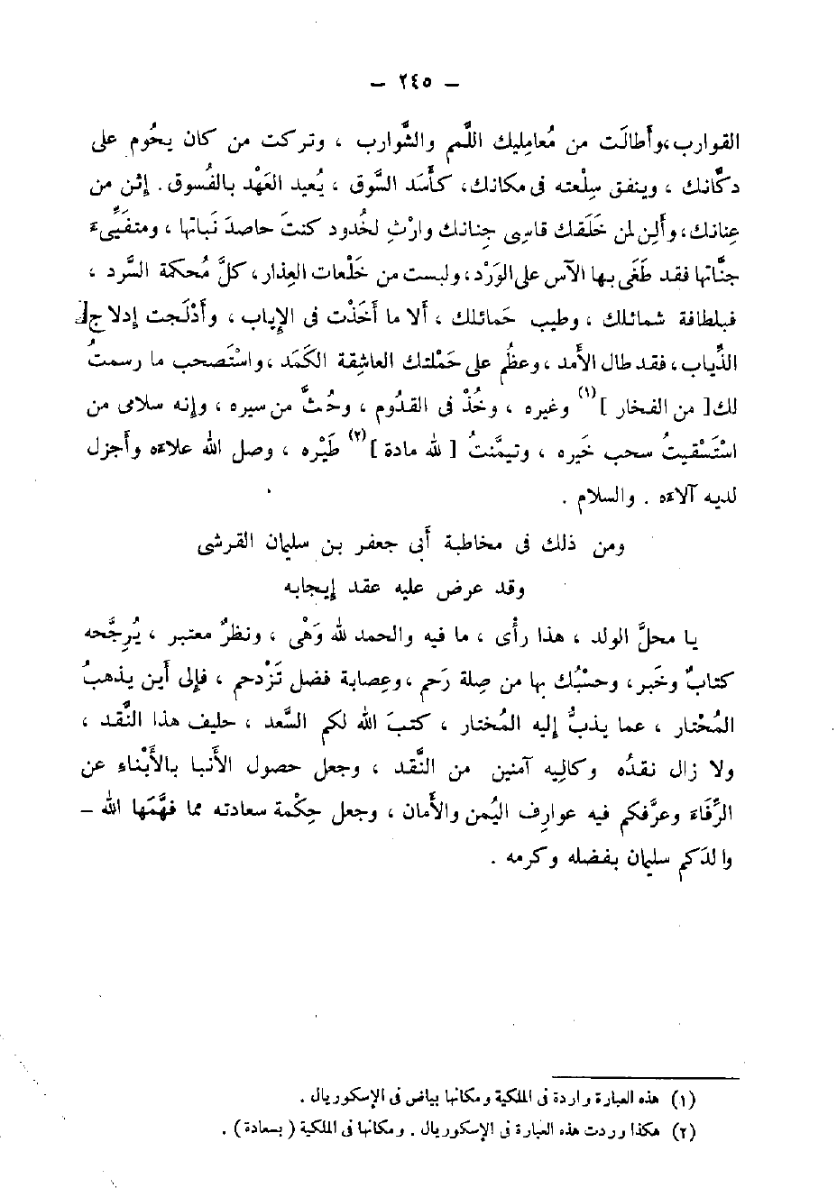 يَا مَحل الْوَلَد، هَذَا رَأْي، مَا فِيهِ وَالْحَمْد لله وَهِي، وَنظر مُعْتَبر، يرجحه كتاب وَخبر، وحسبك بهَا من صلَة رحم، وعصابة فضل تزدحم، فَإلَى أَيْن يذهب الْمُحْتَار، عَمَّا يذب إِلَيْهِ الْمُخْتَار، كتب الله لكم السعد، حَلِيف هَذَا النَّقْد، وَلَا زَالَ نَقده وكاليه آمِنين من النَّقْد، وَجعل حُصُول الأنبا بالأبناء عَن الرفاء ورفكم فِيهِ عوارف الْيمن والأمان، وَجعل حِكْمَة سعادته مِمَّا فهمها الله - والدكم سُلَيْمَان بفضله وَكَرمه.