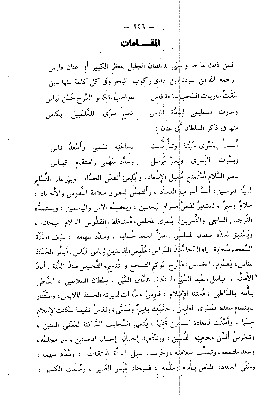 باسم السَّلَام أستمنح مُسبل الإسعاد، وأبلس أنفس الحساد، وبإرسال التَّسْلِيم لسَيِّد الْمُرْسلين، أَسد أسراب الْفساد، وألتمس لسفري سَلامَة النُّفُوس والأجساد، سَلام وسيم، تستعير نفس مسراه الْبَسَاتِين، ويحسده الآس والياسمين، ويستمده النرجس السَّاجِي والنسرين، يسى ر لمجلس، مستخلف القدوس السَّلَام سُبْحَانَهُ، ويستبق لسدة سُلْطَان الْمُسلمين. سل السعد حسامه، وسدد سهامه، سيف السّنة السمحاء سَحَابَة سَمَاء السخا أَسد المراس، ملبس المفسدين لِبَاس الباس، ميسر الْحَسَنَة للنَّاس، يعسوب الْخَمِيس، مسرح سوائم التسجيع والتنسيم والتجنيس سَنَد السّنة، أَسد الأسنة، الباسل السَّيِّد السّني المسدد، السَّامِي السّني، سُلْطَان السلاطين، الساطي بأسه بالساطين، مُسْتَند الْإِسْلَام، فَارس، سدلت لسيرته الْحَسَنَة الملابس، واستنار بابتسام سعده المسري العابس. حَسبك باسم ومسمى، وَنَفس نفيسة سكنت الْإِسْلَام جسما، وأسنت لسعادة الْمُسلمين قسما، ينسى السحايب الساكنة لمسنتي السنين، وتخرس ألسن محاسنه اللسنين، ويستعبد إحسانه إِحْسَان الْمُحْسِنِينَ، سما مَجْلِسه، وَسعد ملتمسه، وتسنت سَلَامَته، وحرست سبل السّنة استقامته، وسدد سَهْمه، وسنى السَّعَادَة للنَّاس بأسه وَسلمهُ، فسبحان ميسر العسير، ومسدي الكسير،