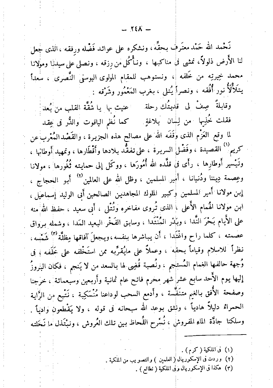 نحمد الله حمد معترف بِحقِّهِ، ونشكره على عوائد فَضله ورفقه، الَّذِي جعل لنا الأَرْض ذلولا، نمشي فِي مناكبها، وَنَأْكُل من رزقه، وَنُصَلِّي على سيدنَا ومولانا مُحَمَّد خيرته من خَلفه، ونستوهب للمقام المولوي اليوسفي النصري، سَعْدا يتلألأ نور أفقه، ونصرا يُتْلَى، بغرب الْمَعْمُور وشرقه: