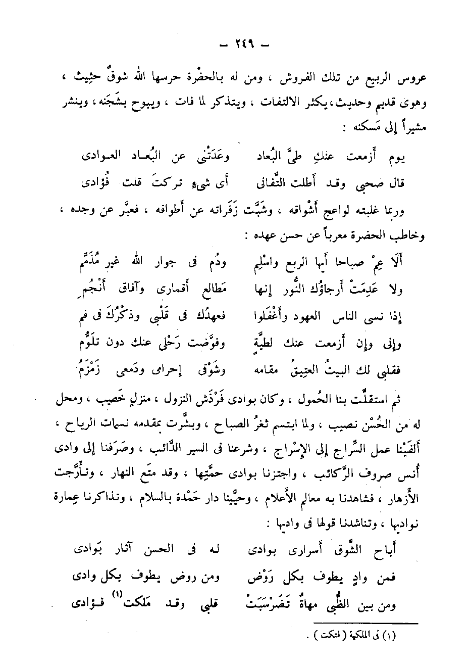 عروس الرّبيع من تِلْكَ الفروش، وَمن لَهُ بالحضرة حرسها الله شوق حثيث، وَهوى قديم وَحَدِيث، يكثر الِالْتِفَات، ويتذكر لما فَاتَ ويبوح بشجنه، وينشر مُشِيرا إِلَى مَسْكَنه: