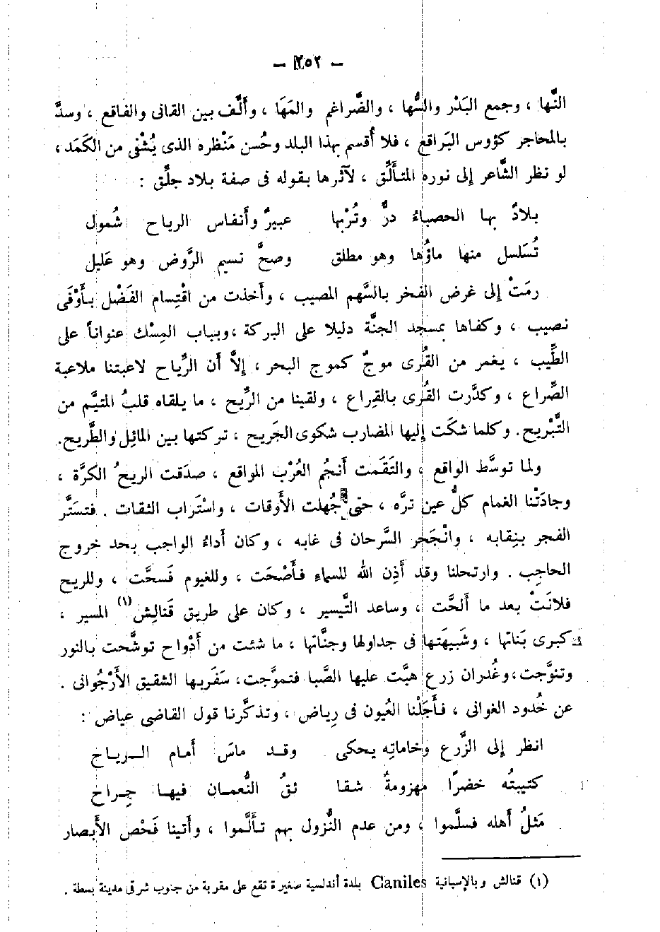 وَلما توَسط الْوَاقِع، والتقمت أنجم الْعَرَب المواقع، صدقت الرّيح الكرة، وجادتنا الْغَمَام كل عين تره، حَتَّى جهلت الْأَوْقَات، واستراب الثِّقَات. فتستر الْفجْر بنقابه، وانحجر السرحان فِي غابه، وَكَانَ أَدَاء الْوَاجِب بِحَدّ خُرُوج الْحَاجِب. وارتحلنا وَقد أذن الله للسماء فأصحت، وللغيوم فسحت، وللريح فَلَانَتْ بعد مَا ألحت، وساعد التَّيْسِير، وَكَانَ على طَرِيق قنالش الْمسير، كبرى بناتها، وشبيهتها فِي جداولها وجناتها، مَا شِئْت من أدواح توشحت بِالنورِ وتنوجت، وغدران زرع هبت عَلَيْهَا الصِّبَا فتموجت، سفربها الشَّقِيق الأرجواني. عَن خدود الغواني، فأجلنا الْعُيُون فِي رياض، وتذكرنا قَول القَاضِي عِيَاض: