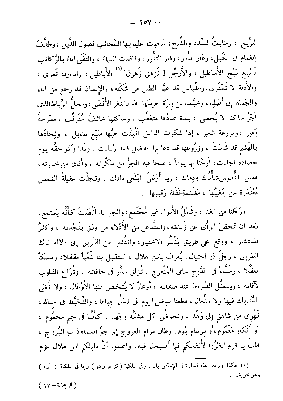 ورحلنا من الْغَد، وَشَمل الأنواء غير مُجْتَمع، والجو قد أنصت كَأَنَّهُ يستمع، يعد أَن تمحض الرَّأْي عَن زبدته، واستدعى من الأذلاء من وثق بنجدته، وَكثر المستشار، وَوَقع على طَرِيق ينشر الِاخْتِيَار، وانتدب من الْفَرِيق إِلَى دلَالَة تِلْكَ الطَّرِيق، رجل ذُو احتيال، يعرف بِابْن هِلَال، اسْتقْبل بِنَا شعبًا مقفلا، ومسلكا مغفلا، وسلما فِي الدرج سامي المنعرج، تزلق الذَّر فِي حَافَّاته، وتراع الْقُلُوب لآفاته، ويتمثل الصِّرَاط عِنْد صِفَاته، أَو عَار لَا يتَخَلَّص مِنْهَا الأوعال، وَلَا تغني السنابك فِيهَا وَلَا النِّعَال، قَطعنَا بَيَاض الْيَوْم فِي تُسنم جبالها، والتخبط فِي جبالها، نهوى من شَاهِق إِلَى وهد، ونخوض كل مشقة وَجهد، كأننا فِي حلم مَحْمُوم، أَو أفكار مغموم، أَو برسام بوم. وَطَالَ مرام العروج إِلَى جو السَّمَاء ذَات البروج، قلت يَا قوم انْظُرُوا لأنفسكم فِيمَا أَصْبَحْتُم فِيهِ، وَاعْلَمُوا أَن دليلكم ابْن هِلَال عزم