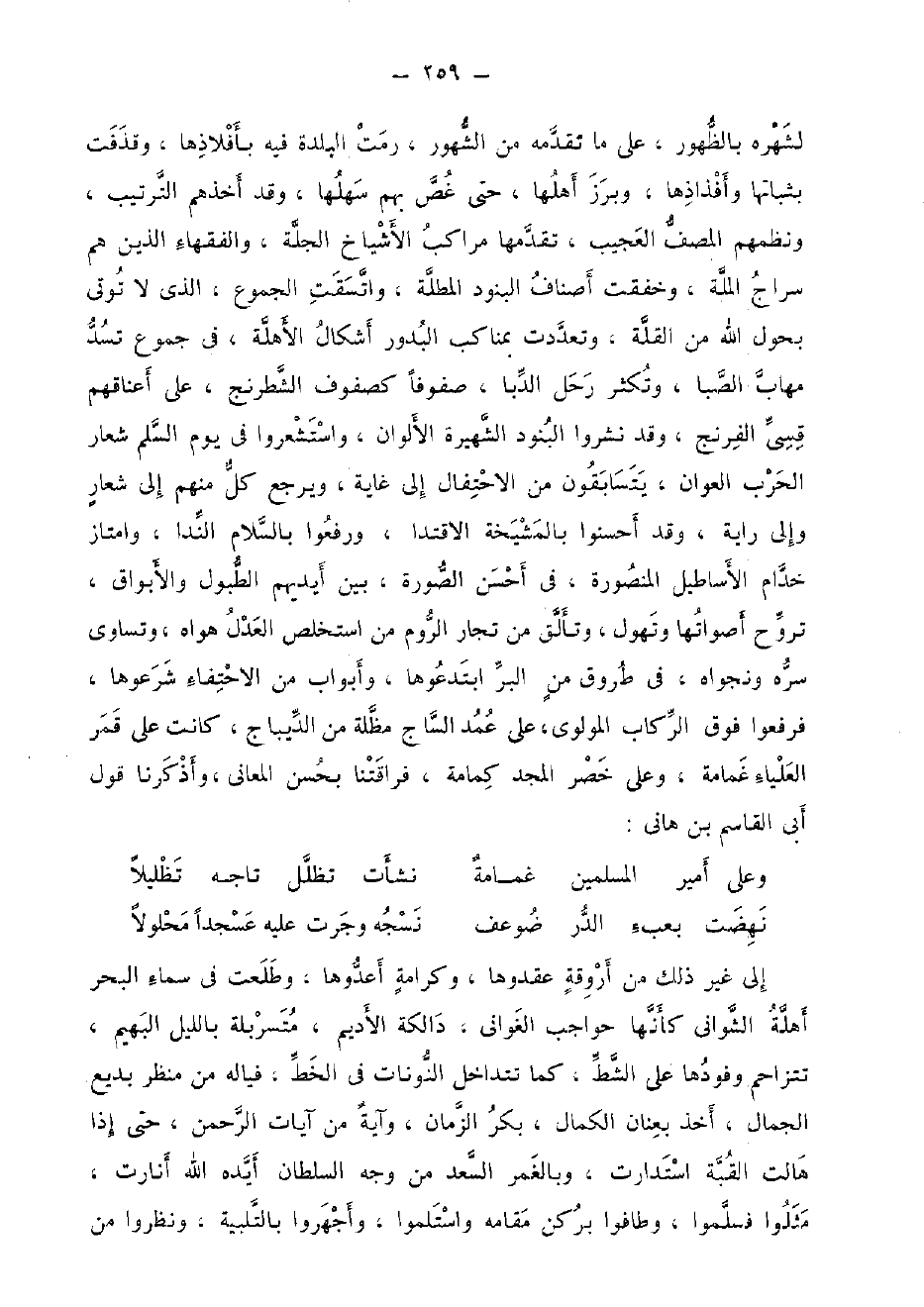 لشهره بالظهور، على مَا تقدمه من الشُّهُور، رمت الْبَلدة فِيهِ بأفلاذها، وقذفت بثباتها وأفذاذها، وبرز أَهلهَا، حَتَّى غص بهم سهلها، وَقد أَخذهم التَّرْتِيب، ونظمهم المصف العجيب، تقدمها مراكب الْأَشْيَاخ الجلة، وَالْفُقَهَاء الَّذين هم سراج الْملَّة، وخفقت أَصْنَاف البنود المطلة، واتسقت الجموع، الَّذِي لَا توتى بحول الله من الْقلَّة، وتعددت بمناكب البدور أشكال الْأَهِلّة، فِي جموع تسد مهاب الصِّبَا، وتكثر رَحل الدبا، صُفُوفا كَصُفُوف الشطرنج، على أَعْنَاقهم قسى الفرنج، وَقد نشرُوا البنود الشهيرة الألوان، واستشعروا فِي يَوْم السّلم شعار الْحَرْب الْعوَان، يتسابقون من الاحتفال إِلَى غَايَة، وَيرجع كل مِنْهُم إِلَى شعار وَإِلَى راية، وَقد أَحْسنُوا بالمشيخة الاقتدا، وَرفعُوا بِالسَّلَامِ الندا، وامتاز خدام الأساطيل المنصورة، فِي أحسن الصُّورَة، بَين أَيْديهم الطبول والأبواق، تروح أصواتها وتهول، وتألق من تجار الرّوم من استخلص الْعدْل هَوَاهُ، وتساوى سره ونجواه، فِي طروق من الْبر ابتدعوها، وأبواب من الاحتفاء شرعوها، فَرفعُوا فَوق الركاب المولوي، على عمد الساج مظلة من الديباج، كَانَت على قمر العلياء غمامة، وعَلى خصر الْمجد كمامة، فراقتنا بِحسن الْمعَانِي، وأذكرنا قَول أبي الْقَاسِم بن هاني: