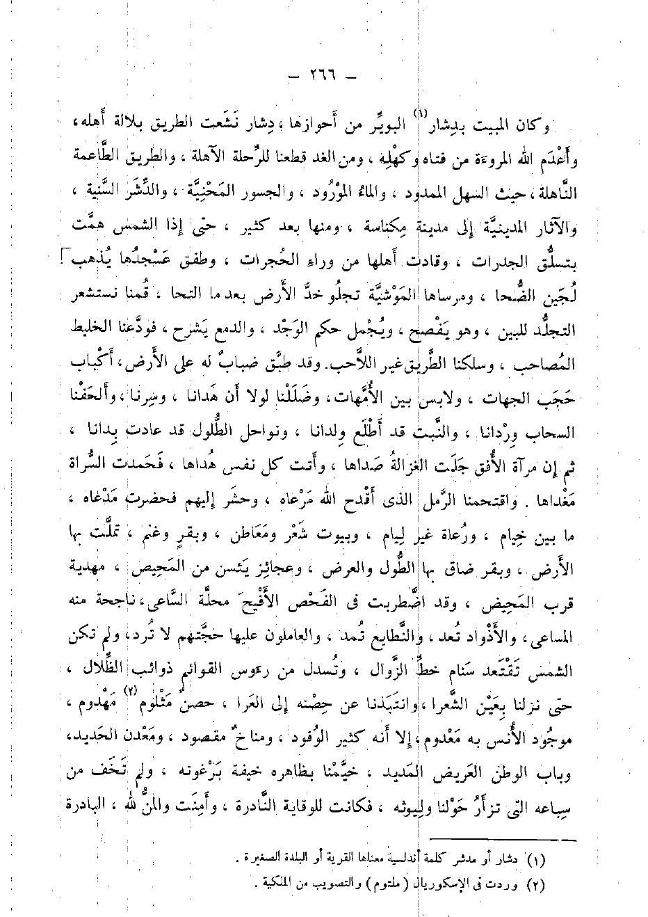 وَكَانَ الْمبيت بدشار البوير من أحوازها، دشار نشعت الطَّرِيق بلالة أَهله، وأعدم الله الْمُرُوءَة من فتاه وكهله، وَمن الْغَد قَطعنَا للرحلة الآهلة، وَالطَّرِيق الطاعمة الناهلة، حَيْثُ السهل الْمَمْدُود، وَالْمَاء المورود، والجسور المحنية، والدشر السّنيَّة، والْآثَار المدينية إِلَى مَدِينَة مكناسة، وَمِنْهَا بعد كثير، حَتَّى إِذا الشَّمْس هَمت بتسلق الجدرات، وقادت أَهلهَا من وَرَاء الحجرات، وطفق عسجدها يذهب لجين الضحا، وَمرْسَاهَا الموشية تجلو خد الأَرْض بَعْدَمَا التحا، قمنا نستشعر التجلد للبين، وَهُوَ يفصح، ويجمل حكم الوجد، والدمع يشْرَح، فودعنا الخليط المصاحب، وسلكنا الطَّرِيق غير اللاحب. وَقد طبق ضباب لَهُ على الأَرْض، أكباب حجب الْجِهَات، ولابس بَين الْأُمَّهَات، وضللنا لَوْلَا أَن هدَانَا، وسرنا، والحفنا السَّحَاب وردانا، والنبت قد أطلع ولدانا، ونواحل الطلول قد عَادَتْ بدانا، ثمَّ إِن مرْآة الْأُفق جلت الغزالة صداها، وَأَتَتْ كل نفس هداها، فحمدت السراة مغداها. واقتحمنا الرمل الذى أقدح الله مرعاه، وَحشر غليهم فَحَضَرت مدعاه، مَا بَين خيام، ورعاة غير ليام، وبيوت شعر ومعاطن، وبقر وغنم، تملت بهَا الأَرْض، وبقر ضَاقَ بهَا الطول وَالْعرض، وعجائز يئسن من المحيص، مهدية قرب الْمَحِيض، وَقد اضْطَرَبَتْ فِي الفحص الأفيح محلّة السَّاعِي، ناجحة مِنْهُ المساعي، والأذواد تعد، والنطايع تمد، والعاملون عَلَيْهَا حجتهم لَا ترد، وَلم تكن الشَّمْس تقتعد سَنَام خطّ الزَّوَال، وتسدل من رُؤُوس القوائم ذوائب الظلال، حَتَّى نزلنَا بِعَين الشعرا، وانتبذنا عَن حصنه إِلَى العرا، حصن مثلوم مهدوم، مَوْجُود الْأنس بِهِ مَعْدُوم، إِلَّا أَنه كثير الْوُفُود، ومناخ مَقْصُود، ومعدن الْحَدِيد، وَبَاب الوطن العريض المديد، خيمنا بِظَاهِرِهِ خيفة برغوته، وَلم تخف من سباعه الَّتِي تزأر حولنا وليوثه، فَكَانَت للوقاية النادرة، وَأمنت والمن لله، البادرة