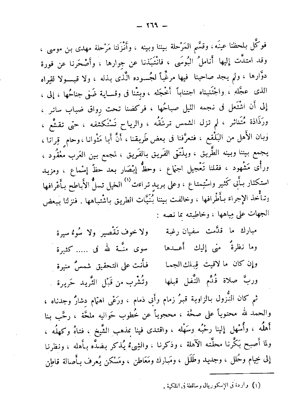 فَوكل بلحظنا عينه، وَقسم المرحلة بَيْننَا وَبَينه، وأنزلنا مرحلة مهْدي بن مُوسَى، وَقد امتدت إِلَيْهَا أنامل البوسي، فانتبذنا عَن جوارها، وأصحرنا عَن قورة دوارها، وَلم يجد صاحبنا فِيهَا مرغبا لجوده الَّذِي بذله، وَلَا قبولا لقراه الَّذِي عجله، واجتنبناه اجتنابا أخجله، وبتنا فِي وقاية ضفى جناحها، إِلَى، إِلَى أَن اشتعل فِي نجمه اللَّيْل صباحها، فركضنا تَحت رواق ضباب سَاتِر، ورذاذة متناثر، لم تزل الشَّمْس ترشقه، والرياح تستكشفه، حَتَّى تقشع، وَبَان الْأَهْل من البلقع، فتعرفنا فِي بعض طريقنا، أَن أَبَا مثوانا، وَحَام قرانا، يجمع بَيْننَا وَبَينه الطَّرِيق، ويلتقي الْفَرِيق بالفريق، لمجمع بَين الْعَرَب مَعْقُود، وَرَأى مشهود، فَقُلْنَا تَعْجِيل اجْتِمَاع، وحظ إبصار بعد حَظّ إسماع، ومزيد استكثار بِأبي كثير واستمتاع، وعَلى بريد تراءت الْخَيل تسل الأباطح بأعرافها وَتَأْخُذ الإجراء بأطرافها، وخالفت بَيْننَا بنيات الطَّرِيق باشتباهها. فنزلنا بِبَعْض الْجِهَات على مياهها، وخاطبته بِمَا نَصه: