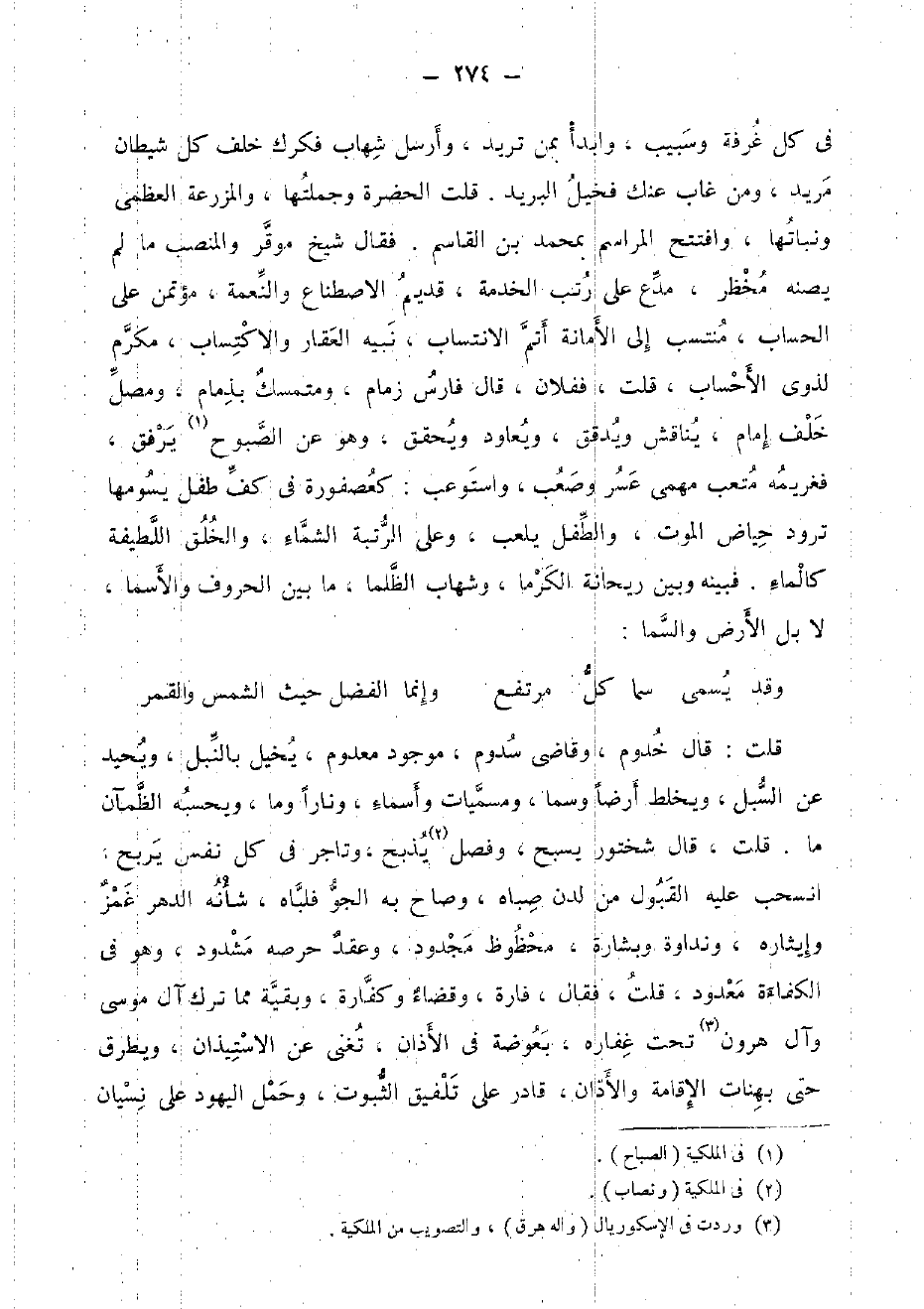 قلت: قَالَ خدوم، وقاضي سدوم، مَوْجُود مَعْدُوم، يخيل بِالنَّبلِ، ويحيد عَن السبل، ويخلط أَرضًا وسما، ومسميات وَأَسْمَاء، وَنَارًا وَمَا، ويحسبه الظمآن مَا. قلت، قَالَ شختور يسبح، وَفصل يذبح، وتاجر فِي كل نفس يربح: انسحب عَلَيْهِ الْقبُول من لدن صباه، وَصَاح بِهِ الجو فلباه، شَأْنه الدَّهْر غمز وإيثاره، ونداوة وَبشَارَة، محظوظ مجدود، وَعقد حرصه مشدود، وَهُوَ فِي الْكَفَاءَة مَعْدُود، قلت، فَقَالَ، فارة، وَقَضَاء وَكَفَّارَة، وَبَقِيَّة مِمَّا ترك آل مُوسَى وَآل هرون تَحت غفاره، بعوضة فِي الْأَذَان، تغني عَن الاستيذان، ويطرق حَتَّى بهنات الْإِقَامَة وَالْأَذَان، قَادر على تلفيق الثُّبُوت، وَحمل الْيَهُود على نِسْيَان