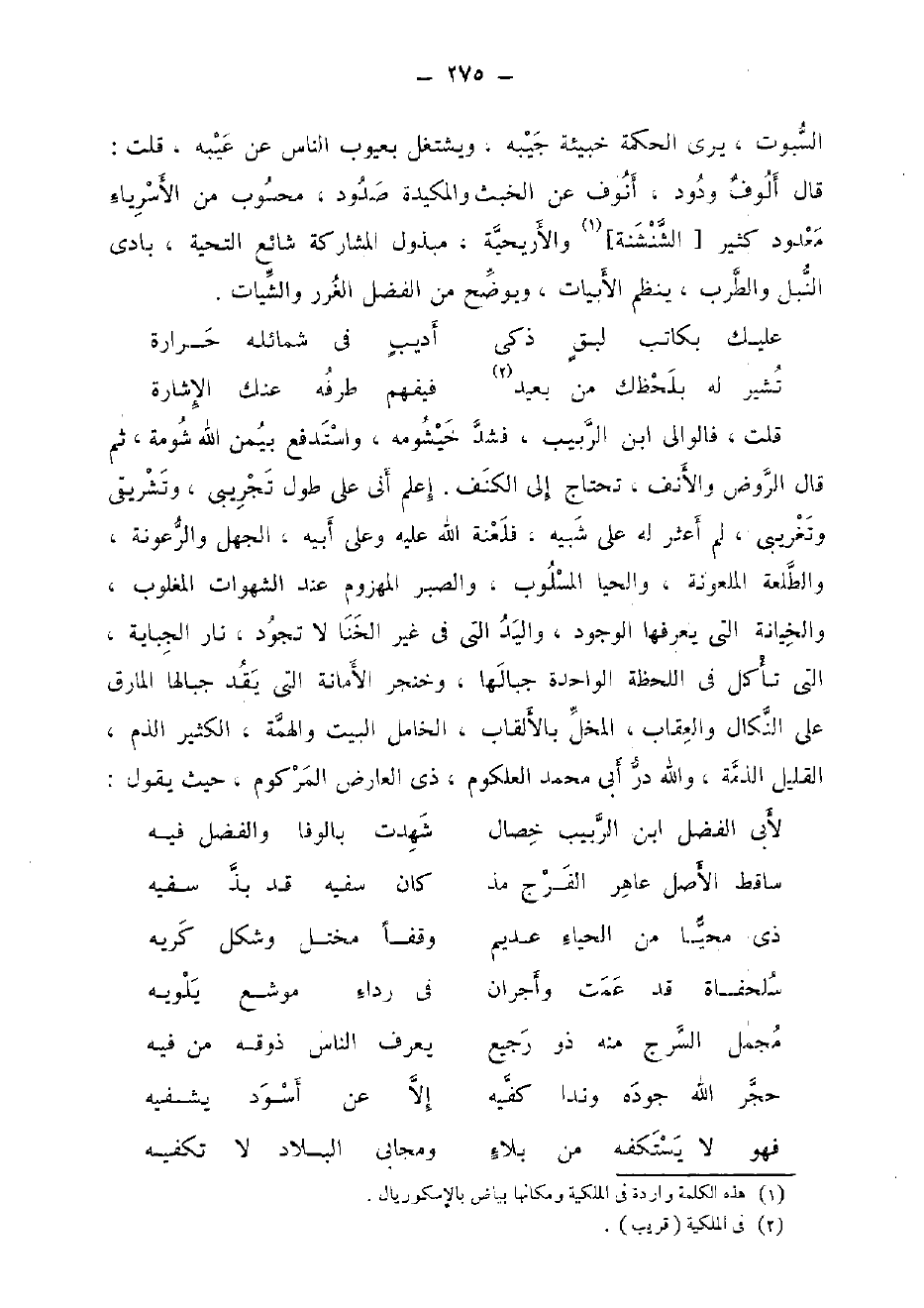 السبوت، يرى الْحِكْمَة خبيئة جيبه، ويشتغل بعيوب النَّاس عَن عَيبه، قلت: قَالَ أُلُوف ودود، أنوف عَن الْخبث والمكيدة صدود، مَحْسُوب من الأسرياء مَعْدُود كثير [الشنشنة] والأريحية، مبذول الْمُشَاركَة شَائِع التَّحِيَّة، بَادِي النبل والطرب، ينظم الأبيات، ويوضح من الْفضل الْغرَر والشيات.