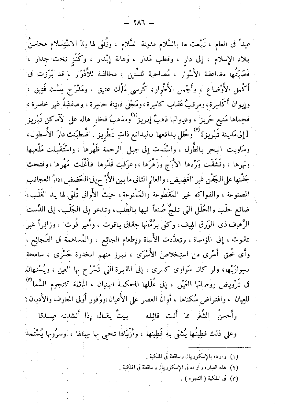 عيدا فِي الْعَام، تبِعت لَهَا بِالسَّلَامِ مَدِينَة السَّلَام، وتلقي لَهَا يَد الاستسلام محَاسِن بِلَاد الْإِسْلَام، إِلَى دَار، وقطب مدَار، وهالة إبدار، وكنز تَحت جِدَار، قصبتها مضاعفة الأسوار، مصاحبة للسنين، مُخَالفَة للأدوار، قد برزت فِي أكمل الأوضاع، وأجمل الأطوار، كرْسِي ملك عَتيق، ومدرج مسك فتيق، وإيوان أكاسرة، ومرقب عِقَاب كاسرة، ومجلى فاتنة حَاسِرَة، وصفقة غير خاسرة، فحماها منيع حريز، وديوانها ذهب إبريز وَمذهب فخار هاله على لآماكن تبريز [إِلَى مَدِينَة تبريز] وحلل بدائعها بالبدائع ذَات تطريز. اضطبنت دَار الأسطول، وساويت الْبَحْر بالطول، واسندت إِلَى جبل الرَّحْمَة ظهرهَا، واستقبلت ملعبها ونهرها، ونشقت وردهَا الأرج وزهرها، وَعرفت قدرهَا فأغلت مهرهَا، وَفتحت جفنها على الجفن غير الغضيض، والعالم الثَّانِي مَا بَين الأوج إِلَى الحضض، دَار الْعَجَائِب المصنوعة، والفواكه غير المقطوعة والممنوعة، حَيْثُ الْأَوَانِي تلقى لَهَا يَد الغلب، ضائع حلب وَالْحلَل الَّتِي تلج صنعا فِيهَا بِالطَّلَبِ، وَتَدْعُو إِلَى الجلب، إِلَى الدست الرهيف ذِي الْوَرق الهيف، وَكفى برمانها حقاق ياقوت، وأمير فَوت، وزائرا غير ممقوت، إِلَى المؤاساة، وتعددت الأساة وإطعام الجائع، والمساهمة فِي الفجائع، وَأي خلق أسرى من استخلاص الأسرى، تبرز مِنْهُم المخدرة حسرى، سامحة بسواريها، وَلَو كَانَا سواري كسْرَى، إِلَى الْمقْبرَة الَّتِي تسرح بهَا الْعين، ويستهان فِي ترويض روضاتها الْعين، إِلَى غللها المحكمة الْبُنيان، الماثلة كنجوم السما للعيان، وافتراض سكناهَا، أَوَان الْعَصْر على الْأَعْيَان، ووفور أولى المعارف والأديان: