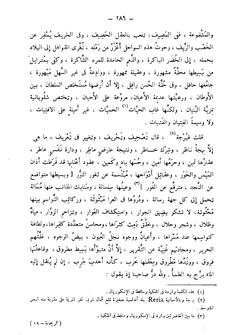 والمشفوعة، فَفِي المصيف، تلعب بِالْعقلِ الحصيف، وَفِي الخريف يسفر عَن الخصب والريف، وحوت هَذِه السواحل أغزر من رمله، تغرى القوافل إِلَى الْبِلَاد بِحمْلِهِ، إِلَى الْخضر الباكرة، وَالنعَم الحامدة للمرء الشاكرة، وَكفى بمترايل من بسيطها محلّة مَشْهُورَة، وعقيلة ممهورة، ووادعة فِي غير السهل مبهورة، جَامعهَا حافل، وَفِي حلَّة الْحسن رافل، إِلَّا أَن أرْضهَا مستخلص السُّلْطَان، بَين الأوطان، ورعيتها عديمة الْأَعْيَان، مروعة على الأحيان، وتختص شلوبانية بمزية الْبُنيان، وَلكنهَا غَابَ الْحَيَّات الحميات، غير أمينة على الافتيات، وَلَا وسيمة الفتيان والفتيات. قلت فبرجة، قَالَ تَصْحِيف وتحريف، وتغيير فِي تَعْرِيف، مَا هِيَ إِلَّا بهجة نَاظر، وشرك خاطر، ونتيجة عَارض ماطر، ودارة نفس عاطر، عقارها ثمين، وحرمها أَمِين، وحسها باد وكمين، عُقُود أعنابها قد قرطت أَذَان الميس والحور، وعقائل أدواحها، مبتسمة عَن ثغور النُّور [وبسيطها متواضع عَن النجد، مترفع عَن الْغَوْر] وعينها سلسالة، وسنابك المذانب مِنْهَا مسالة تحمل إِلَى كل جِهَة رِسَالَة، ودروها فِي العرا مبثوثة، وركائب النواسم بَينهَا محثوثة، لَا تَشْكُو بِضيق الْجوَار، واستكشاف العوار، وتزاحم الزوار، مياه وظلال، وَشَجر وحلال، وَخلق دمث كثراها، ومحاسن مُتعَدِّدَة كقراها، ولطافة كنواسمها عِنْد مسراها، وأعيان ووجوه نجل الْعُيُون، بيض الْوُجُوه، غلتهم الْحَرِير، ومجادتهم غنية عَن التَّقْرِير، إِلَّا أَن متبوأها بسيط مطروق، وقاعدتها فروق، ووتدها مطروق ومعقلها خرب، كَأَنَّهُ أحدب جرب، إِن لم ينْقل إِلَيْهِ المَاء برح بِهِ الظمأ. وَللَّه در صاحبنا إِذْ يَقُول: