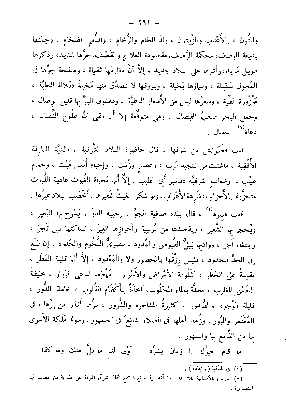 والمتون، بالأعناب وَالزَّيْتُون، بلد الخام والرخام، والذمم الضخام، وحمتها بديعة الْوَصْف، محكمَة الرصف، مَقْصُودَة العلاج والقصف، حرهَا شَدِيد، وَذكرهَا طَوِيل مديد، وأثرها على الْبِلَاد جَدِيد، إِلَّا أَن مغارمها ثَقيلَة، وصفحة جوها فِي المحول صقيلة، وسماؤها بخيلة، وبروقها لَا تصدق مِنْهَا مخيلة دبلالة النطية، منزورة الطية، وسعرها لَيْسَ من الأسعار الوطية، ومعشوق الْبر بهَا قَلِيل الْوِصَال، وَحمل الْبَحْر صَعب الفصال، وَهِي متوقعة إِلَّا أَن يقي الله طُلُوع النصال، دعاة النصال.