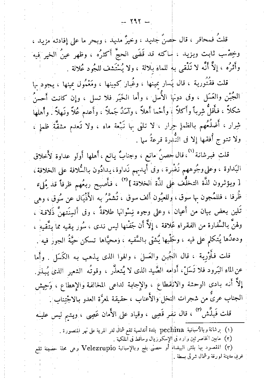 قلت فأورية، قَالَ الْجُبْن وَالْعَسَل، والهوا الَّذِي يذهب بِهِ الكسل. وَأما عَن المَاء البرود فَلَا تسل، أدامه الصَّيْد الَّذِي لَا يتَعَذَّر، وقوته الشّعير الَّذِي يبذر. إِلَّا أَنه بَادِي الوحشة والانقطاع، والإجابة لداعي الْمُخَالفَة والإهطاع، وحيش الجناب عرى من شجرات النّخل وَالْأَعْنَاب، حَقِيقَة لمعرة الْعَدو بالاجتناب.