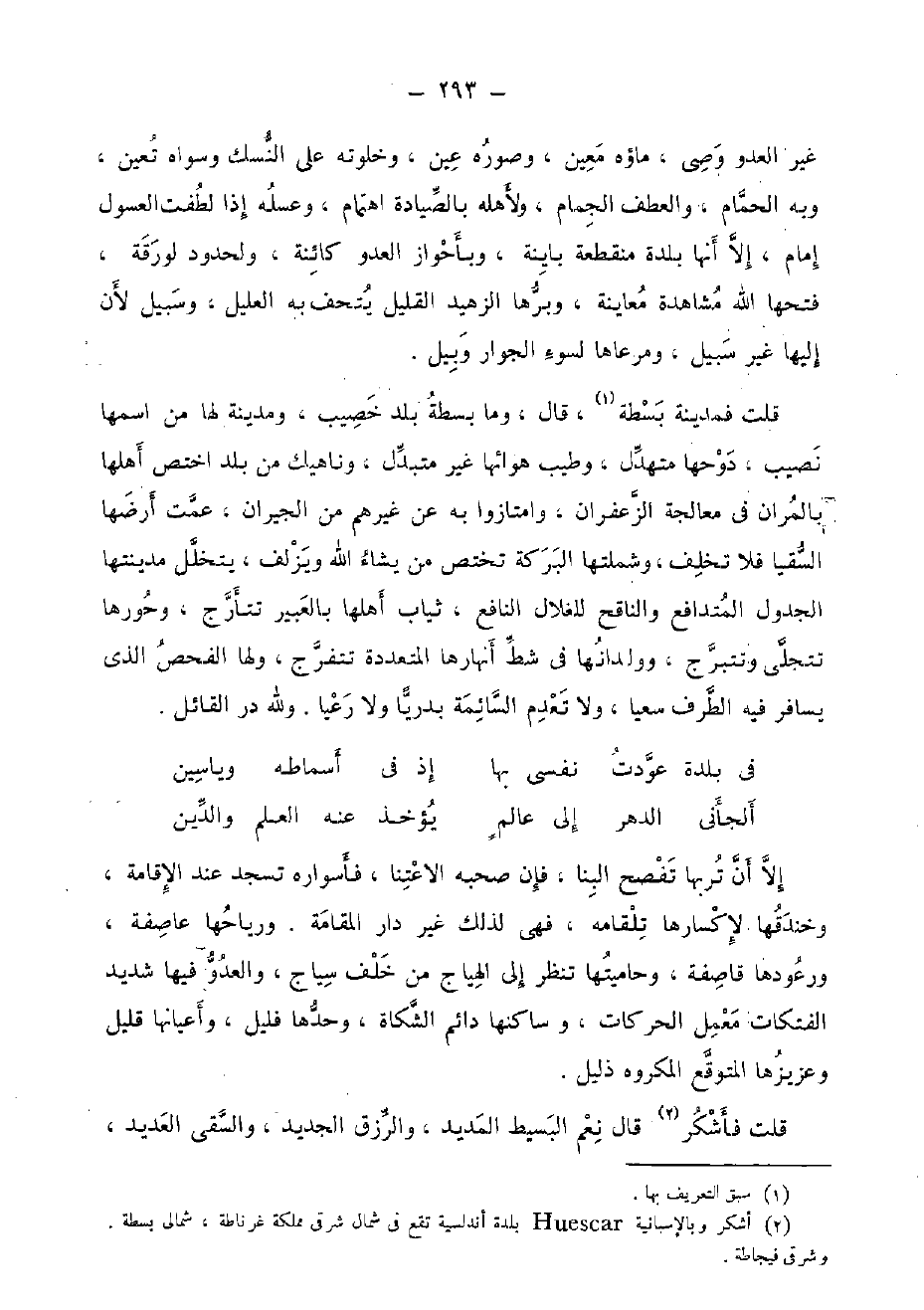 قلت فمدينة بسطة، قَالَ، وَمَا بسطة بلد خصيب، ومدينة لَهَا من اسْمهَا نصيب، دوحها متهدل، وَطيب هوائها غير متبدل، وناهيك من بلد اخْتصَّ أَهلهَا بالمران فِي معالجة الزَّعْفَرَان، وامتازوا بِهِ عَن غَيرهم من الْجِيرَان، عَمت أرْضهَا السقيا فَلَا تخلف، وشملتها الْبركَة تخْتَص من يَشَاء الله ويزلف، يَتَخَلَّل مدينتها الْجَدْوَل المتدافع والناقح للغلال النافع، ثِيَاب أَهلهَا بالعبير تتأرج، وحورها تتجلى وتتبرج، وولدانها فِي شط أنهارها المتعددة تتفرج، وَلها الفحص الَّذِي يُسَافر فِيهِ الطّرف سعيا، وَلَا تعدم السَّائِمَة بَدْرِيًّا وَلَا رعيا. وَللَّه در الْقَائِل.