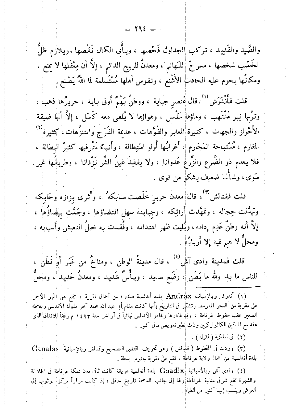 قلت فأندرش، قَالَ عنصر جباية، ووطن بهم أولى باية، حريرها ذهب، وتربها تبر منتهب، وماؤها سلسل، وهواؤها لَا يلفي مَعَه كسل، إِلَّا أَنَّهَا ضيقَة الأحواز والجهات، كَثِيرَة المعابر والفوهات، عديمة الْفرج والمتنزهات، كَثِيرَة المغارم، مستباحة الْمَحَارِم، أغرابها أولو استطالة، وأنباء مُتْرَفِيهَا كثير البطالة، فَلَا يعْدم ذُو الضَّرع وَالزَّرْع عُدْوانًا، وَلَا يفقد عين الشَّرّ نزقانا، وطريقها غير سوي، وشأنها ضَعِيف يشكو من قوى.