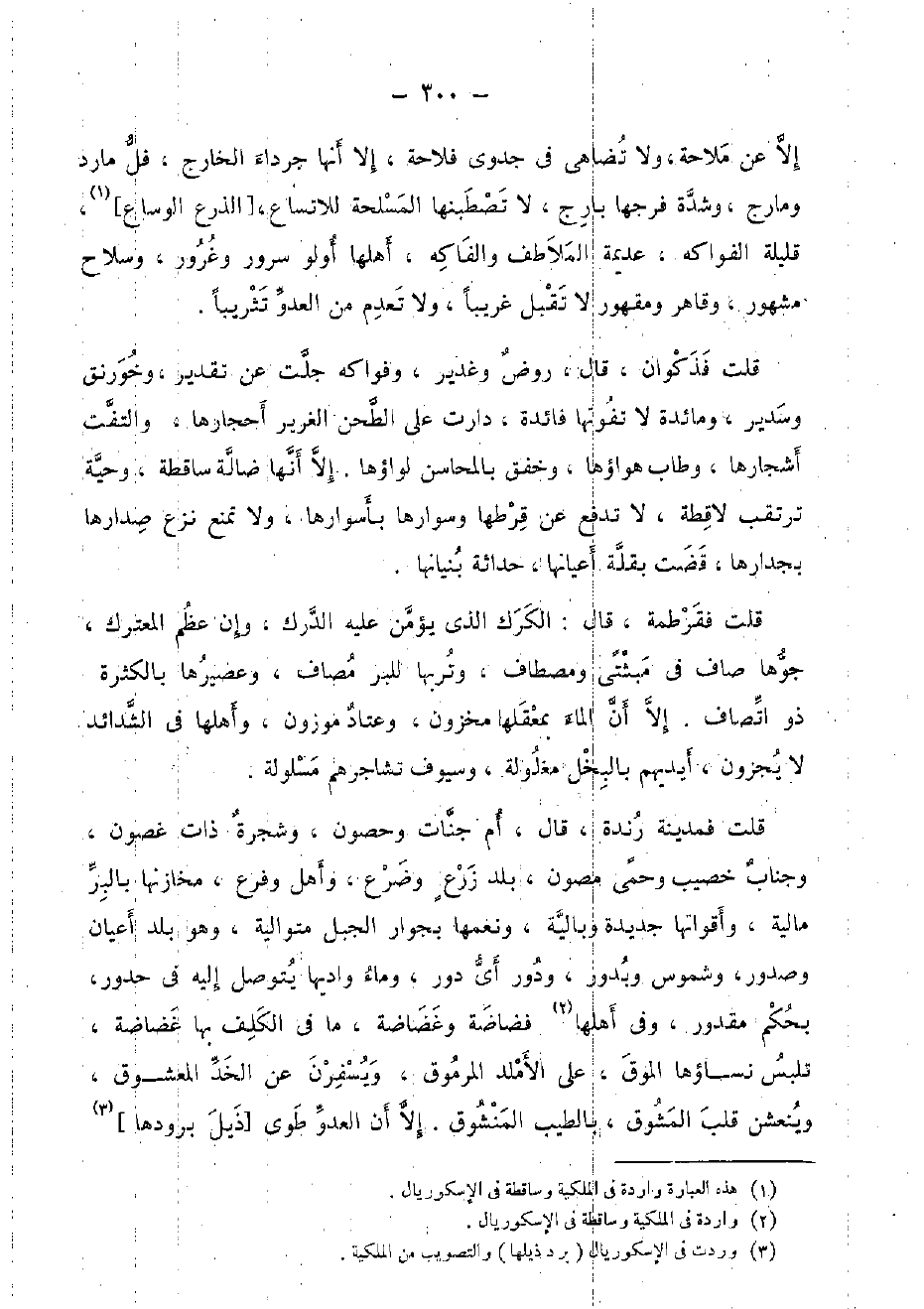 إِلَّا عَن ملاحة، وَلَا تضاهي فِي جدوى فلاحة، إِلَّا أَنَّهَا جرداء الْخَارِج، فل مارد ومارج، وَشدَّة فرجهَا بارج، لَا تصطبنها المسلحة للاتساع، [الذرع الوساع] ، قَليلَة الْفَوَاكِه، عديمة الملاطف والفاكه، أَهلهَا أولو سرُور وغرور، وَسلَاح مَشْهُور، وقاهر ومقهور لَا تقبل غَرِيبا، وَلَا تعدم من الْعَدو تثريبا.