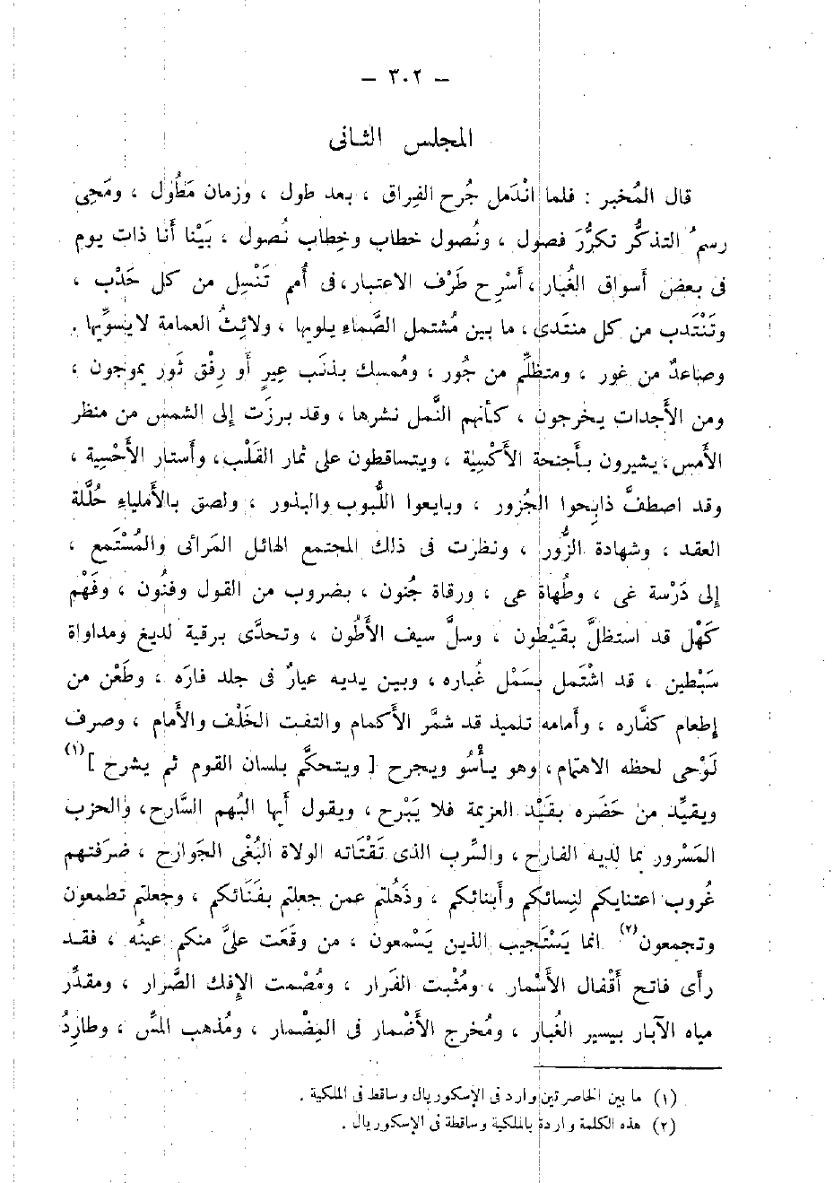 قَالَ الْمخبر: فَلَمَّا اندمل جرح الْفِرَاق، بعد طول، وزمان مطول، ومحى رسم التَّذَكُّر تكَرر فُصُول، ونصول خطاب وخطاب نصول، بَينا أَنا ذَات يَوْم فِي بعض أسواق الْغُبَار، أسرح طرف الِاعْتِبَار، فِي أُمَم تنسل من كل حدب، وتنتدب من كل منتدى، مَا بَين مُشْتَمل الصماء يلويها، ولائث الْعِمَامَة لَا يسويها. وصاعد من غور، ومتظلم من جور، وممسك بذنب عير أَو رفق ثَوْر يموجون، وَمن الأجداث يخرجُون، كَأَنَّهُمْ النَّمْل نشرها، وَقد برزت إِلَى الشَّمْس من منظر الأمس، يشيرون بأجنحة الأكسية، ويتساقطون على ثمار الْقلب، وأستار الأحسية، وَقد اصطف ذابحوا الْجَزُور، وَبَايَعُوا اللبوب والبذور، ولصق بالأملياء حللة العقد، وَشَهَادَة الزُّور، وَنظرت فِي ذَلِك الْمُجْتَمع الهائل الْمرَائِي والمستمع، إِلَى درسة غي، وطهاة عي، ورقاة جُنُون، بضروب من القَوْل وفنون، وَفهم كهل قد استظل بقيطون، وسل سيف الأطون، وتحدى برقية لديغ ومداواة سبطين، قد اشْتَمَل بسمل غباره، وَبَين يَدَيْهِ عيار فِي جلد فاره، وَطعن من إطْعَام كفاره، وأمامه تلميذ قد شمر الأكمام والتفت الْخلف والأمام، وَصرف لوحي لحظه الاهتمام، وَهُوَ يأسو ويجرح [ويتحكم بِلِسَان الْقَوْم ثمَّ يشْرَح] ويقيد من حَضَره بِقَيْد الْعَزِيمَة فَلَا يبرح، وَيَقُول أَيهَا البهم السارح، والحزب المسرور بِمَا لَدَيْهِ الفارح، والسرب الَّذِي تقتاته الْوُلَاة الْبَغي الْجَوَارِح، ضرفتهم غرُوب اعتنايكم لنسائكم وأبنائكم، وذهلتم عَمَّن جعلتم بفنائكم، وجعلتم تطمعون وتجمعون إِنَّمَا يستجيب الَّذين يسمعُونَ، من وَقعت عَليّ مِنْكُم عينه، فقد رأى فاتح أقفال الأسمار، ومثبت الْفِرَار، ومصمت الْإِفْك الصرار، ومقدر مياه الْآبَار بسير الْغُبَار، ومخرج الأضمار فِي الْمِضْمَار، وَمذهب الْمس، وطارد