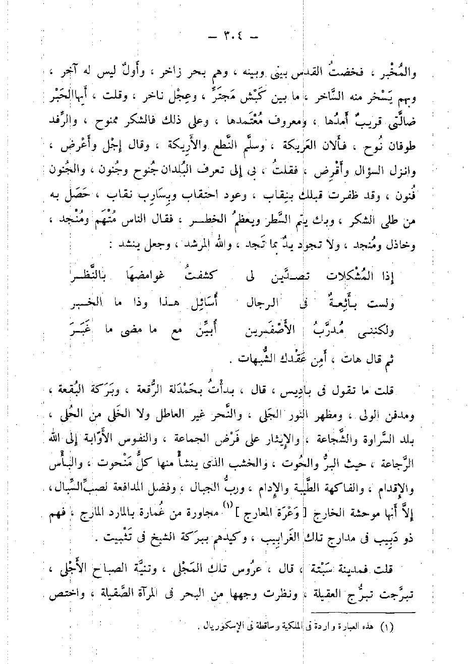 والمخبر، فخضت الْقُدس بيني وَبَينه، وهم بَحر زاخر، وَأول لَيْسَ لَهُ آخر، وبهم يسخر مِنْهُ الساخر، مَا بَين كَبْش مجتر، وَعجل ناخر، وَقلت، أَيهَا الحبر ضالتي قريب أمدها، ومعروف معتمدها، وعَلى ذَلِك فالشكر ممنوح والرفد طوفان نوح، فألان العريكة، وَسلم النطع والأريكة، وَقَالَ إجل أعرض، وَانْزِلْ السُّؤَال وأقرض، فَقلت، بِي إِلَى تعرف الْبلدَانِ جنوح وجنون، وَالْجُنُون فنون، وَقد ظَفرت قبلك بنقاب، وعود احتقاب وبسارب نقاب، حصل بِهِ من طلى الشُّكْر، وَبِك يتم السطر ويعظم الْخطر، فَقَالَ النَّاس مُتَّهم ومنجد، وخاذل ومنجد، وَلَا تجود يَد بِمَا تَجِد، وَالله المرشد، وَجعل ينشد: