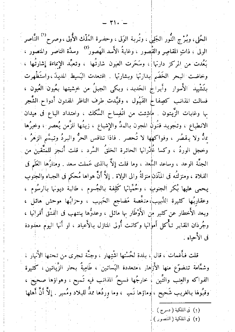 الحلى، وبرج النُّور الْجَلِيّ، وتربة الْوَلِيّ، وحضرة الْملك الأولى، وَصرح النَّاصِر الْوَلِيّ، ذَات المقاصر والقصور، وغابة الْأسد الهصور وسدة النَّاصِر والمنصور، بَعدت من المركز دارتها، وسحرت الْعُيُون شارتها، وَتعبد الإيماءة إشارتها، وخاضت الْبَحْر الخضم بدارتها وبشارتها. اقتعدت الْبَسِيط المديد، واستظهرت بتشييد الأسوار وأبراج الْحَدِيد، وَبكى الْجَبَل من خشيتها بعيون الْعُيُون، فسالت المذانب كصفاح القيول، وقيدت طرف النَّاظر الْمفْتُون أدواح الشّجر بهَا وغابات الزَّيْتُون. مَا شِئْت من انفساح السكَك، وامتداد الباع فِي ميدان الانطباع، وتجويد فنون المجون بِالْمدِّ والإشباع، زيتها للمزمن يعصر، وَخَيرهَا يمد وَلَا يقصر، وفواكهها لَا تحصر. فَإِذا تنافس الْحر وَالْبرد وَتَبَسم الزهر، وخجل الْورْد، وكسا غدرانها الحائرة الْخلق السرد، قلت انجز لِلْمُتقين من الْجنَّة الْوَعْد، وساعد السعد، وَمَا قلت إِلَّا بِالَّذِي عملت سعد. ومنارها الْعلم فِي الفلاة، ومنزلته فِي المآذن منزلَة والى الْوُلَاة. إِلَّا أَن هَواهَا مُحكم فِي الجباه والجنوب يحمى عَلَيْهَا بكر الْجنُوب، وحمياتها كلفة بالجسوم، طالبة ديونها بالرسوم، وعقاربها كَثِيرَة الدبيب، منغصة مضاجع الحبيب، وحزابها موحش هائل، وَبعد الأخطار عَن كثير من الأوطار بهَا مائل، وعدوها ينتهب فِي الفتق أقرانها، وجرذان الْمَقَابِر تَأْكُل أمواتها وَكَانَت أولى الْمنَازل بالأعياد، لَو أَنَّهَا الْيَوْم مَعْدُودَة فِي الْأَحْيَاء.