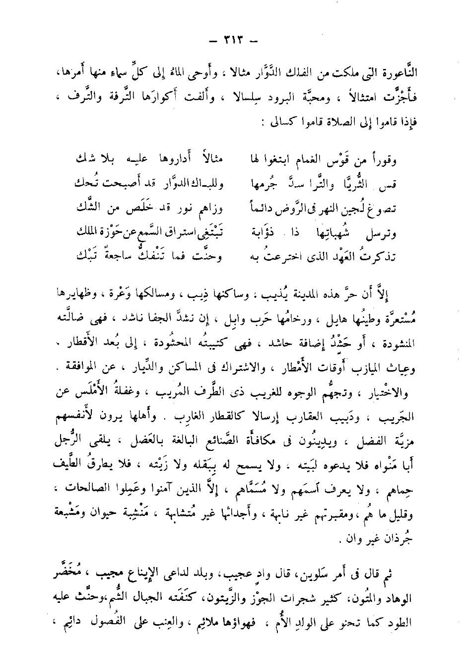 ثمَّ قَالَ فِي أَمر سلوين، قَالَ وَاد عَجِيب، وبلد لداعي الإيناع مُجيب، مخضر الوهاد والمتون، كثير شجرات الْجَوْز وَالزَّيْتُون، كنفته الْجبَال الشم، وَحنث عَلَيْهِ الطود كَمَا تحنو على الْوَلَد الْأُم، فهواؤها ملائم، وَالْعِنَب على الْفُصُول دَائِم،