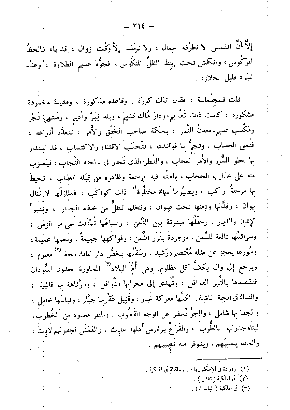 قلت فسجلماسة، فَقَالَ تِلْكَ كورة. وَقَاعِدَة مَذْكُورَة، ومدينة محمودة مشكورة، كَانَت ذَات تَقْدِيم، وَدَار ملك قديم، وبلد تبر وأديم، ومنتهى تجر ومكسب عديم، مَعْدن التَّمْر، بحكمة صَاحب الْخلق وَالْأَمر، تَتَعَدَّد أَنْوَاعه، فتعيي الْحساب، وتجم بهَا فوائدها، فتحسب الاقتناء والاكتساب، قد اسْتَدَارَ بهَا لحلو السُّور وَالْأَمر العجاب، والقطر الَّذِي تحار فِي ساحته النجاب، فَيضْرب مِنْهُ على عذاريها الْحجاب، بَاطِنه فِيهِ الرَّحْمَة وَظَاهره من قبله الْعَذَاب، تحيط بهَا مرحلة رَاكب، ويصيرها سَمَاء مخطرة ذَات كواكب، فمنازلها لَا تنَال بهوان، وفدانها ودمنها تَحت صوان، ونخلها تطل من خَلفه الْجِدَار، وتتبوأ الْإِيمَان والديار، وحللها مبتوتة بَين الدمن، وضياعها تمتلك على مر الزَّمن، وسوائمها تالعة للسمن، مَوْجُودَة بنزر الثّمن، وفواكهها جميمة، ونعمها عميمة، وسورها يعجز عَن مثله معتصم ورشيد، وسقيها يخص دَار الْملك بحظ مَعْلُوم، وَيرجع إِلَى وَال يكف كل مظلوم. وَهِي أم الْبِلَاد الْمُجَاورَة لحدود السودَان فتقصدها بالتبر القوافل، وتهدي إِلَى مِحْرَابهَا النَّوَافِل، والرفاهة بهَا فَاشِية، وَالنِّسَاء فِي الْحلَّة ناشية. لَكِنَّهَا معركة غُبَار، وقتيل عقربها جَبَّار، ولباسها خامل، والجفا بهَا شَامِل، والجو يسفر عَن الْوَجْه القطوب، والمطر مَعْدُود من الخطوب، لبِنَاء جدرانها بالطوب، والقرع برؤوس أَهلهَا عابث، والعمش لجفونهم لابث، والحصا يصيبهم، ويتوفر مِنْهُ نصِيبهم.