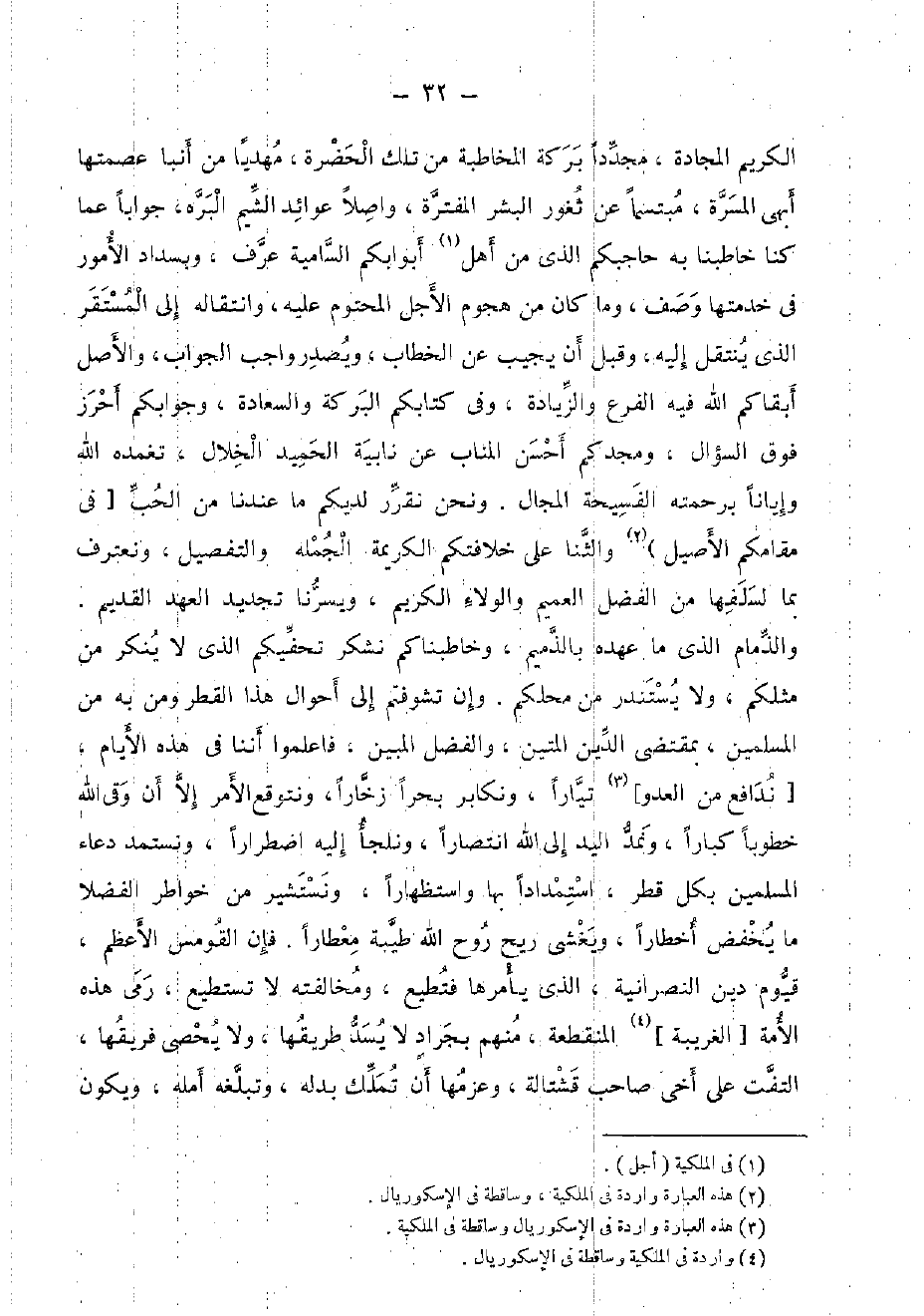 الْكَرِيم المجادة، مجددا بركَة المخاطبة من تِلْكَ الحضرة، مهديا من أنبا عصمتها أبهى المسرة، مُبْتَسِمًا عَن ثغور الْبشر المفترة، واصلا عوائد الشيم البره، جَوَابا عَمَّا كُنَّا خاطبنا بِهِ حاجبكم الَّذِي من أهل أبوابكم السامية عرف، وبسداد الْأُمُور فِي خدمتها وصف، وَمَا كَانَ من هجوم الْأَجَل المحتوم عَلَيْهِ، وانتقاله إِلَى المستقر الَّذِي ينْتَقل إِلَيْهِ، وَقبل أَن يُجيب عَن الْخطاب، ويصدر وَاجِب الْجَواب، وَالْأَصْل أبقاكم الله فِيهِ الْفَرْع وَالزِّيَادَة، وَفِي كتابكُمْ الْبركَة والسعادة، وجوابكم أحرز فَوق السُّؤَال، ومجدكم أحسن المناب عَن نابية الحميد الْخلال، تغمده الله وإيانا برحمته الفسيحة المجال. وَنحن نقرر لديكم مَا عندنَا من الْحبّ [فِي مقامكم الْأَصِيل) والثنا على خلافتكم الْكَرِيمَة الْجُمْلَة وَالتَّفْصِيل، ونعترف بِمَا لسلفها من الْفضل العميم وَالْوَلَاء الْكَرِيم، ويسرنا تَجْدِيد الْعَهْد الْقَدِيم. والذمام الَّذِي مَا عَهده بالذميم، وخاطبناكم نشكر تحفيكم الَّذِي لَا يُنكر من مثلكُمْ، وَلَا يستندر من محلكم. وَإِن تشوفتم إِلَى أَحْوَال هَذَا الْقطر وَمن بِهِ من الْمُسلمين، بِمُقْتَضى الدّين المتين، وَالْفضل الْمُبين، فاعلموا أننا فِي هَذِه الْأَيَّام، [ندافع من الْعَدو] تيارا، ونكابر بحرا زخارا، ونتوقع الْأَمر إِلَّا أَن وقى الله خطوبا كبارًا، ونمد الْيَد إِلَى الله انتصارا، ونلجأ إِلَيْهِ اضطرارا، ونستمد دُعَاء الْمُسلمين بِكُل قطر، استمدادا بهَا واستظهارا، ونستشير من خواطر الفضلا مَا يخْفض أخطارا، ويغشى ريح روح الله طيبَة معطارا. فَإِن القومس الْأَعْظَم، قيوم دين النَّصْرَانِيَّة، الَّذِي يأمرها فتطيع، ومخالفته لَا تَسْتَطِيع، رمى هَذِه الْأمة [الغريبة] المنقطعة، مِنْهُم بجراد لَا يسد طريقها، وَلَا يُحْصى فريقها، الْتفت على أخي صَاحب قشتالة، وعزمها أَن تملك بدله، وتبلغه أمله، وَيكون
