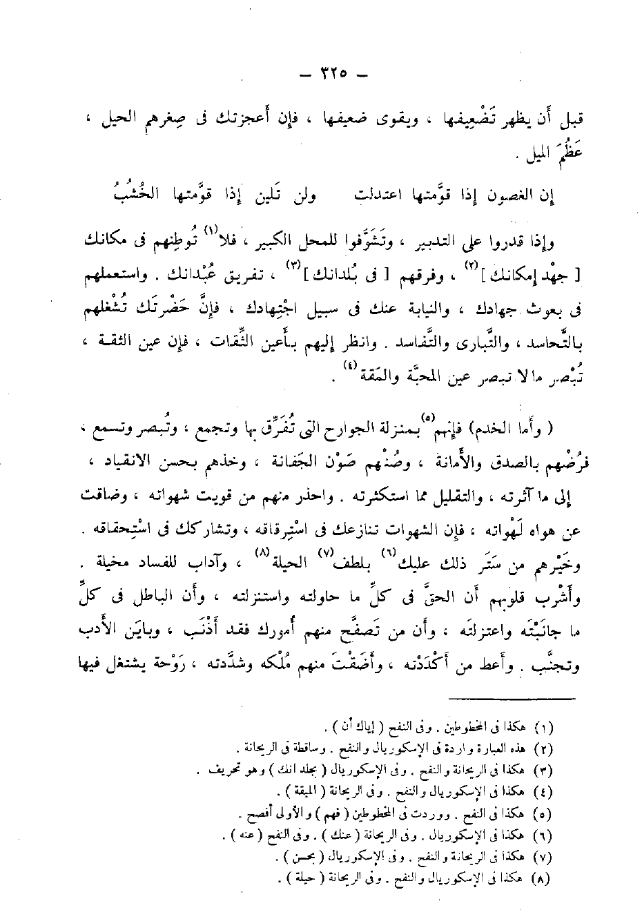 وَإِذا قدرُوا على التَّدْبِير، وتشوفوا للمحل الْكَبِير، فَلَا توطنهم فِي مَكَانك [جهد إمكانك] ، وفرقهم [فِي بلدانك] ، تَفْرِيق عبدانك. واستعملهم فِي بعوث جهادك، والنيابة عَنْك فِي سَبِيل اجتهادك، فان حضرتك تشغلهم بالتحاسد، والتباري والتفاسد. وَانْظُر إِلَيْهِم بأعين الثِّقَات، فان عين الثِّقَة، تبصر مَالا تبصر عين الْمحبَّة والمقة.
