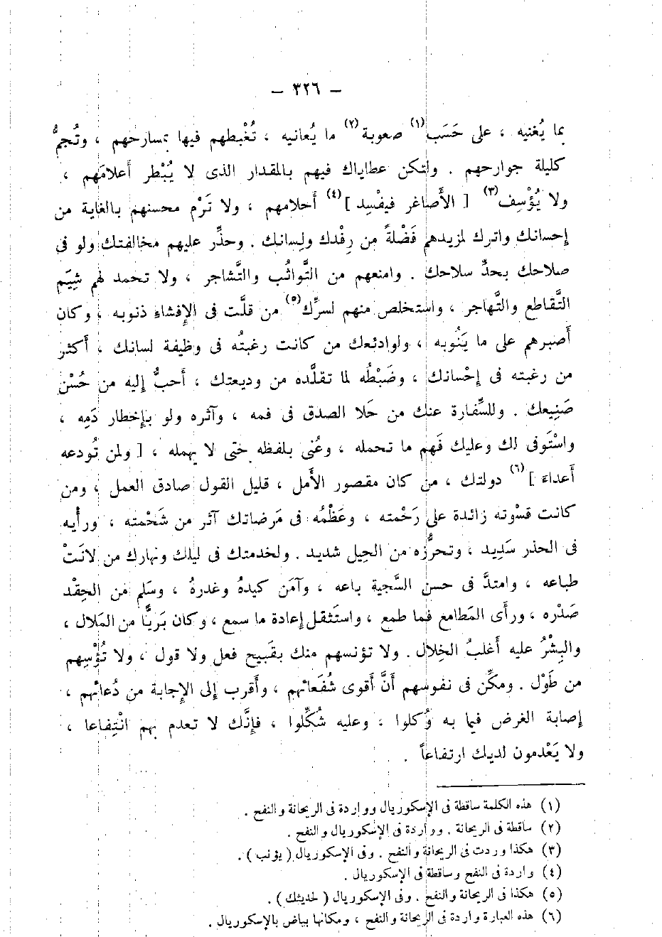 بِمَا يُغْنِيه، على حسب صعوبة مَا يعانيه، تغبطهم فِيهَا بمسارحهم، وتجم كليلة جوارحهم. ولتكن عطاياك فيهم بالمقدار الَّذِي لَا يبطر أعلامهم، وَلَا يؤسف [الأصاغر فَيفْسد] أحلامهم، وَلَا ترم محسنهم بالغاية من إحسانك واترك لمزيدهم فضلَة من رفدك وَلِسَانك، وحذر عَلَيْهِم مخالفتك وَلَو فِي صلاحك بِحَدّ سِلَاحك، وامنعهم من التواثب والتشاجر، وَلَا تحمد لَهُم شيم التقاطع والتهاجر، واستخلص مِنْهُم لسرك من قلت فِي الإفشاء ذنُوبه، وَكَانَ أصبرهم على مَا ينوبه، ولودائعك من كَانَت رغبته فِي وَظِيفَة لسَانك، أَكثر من رغبته فِي إحسانك، وَضَبطه لما تقلده من وديعتك، أحب إِلَيْهِ من حسن صنيعك. وللسفارة عَنْك من حلا الصدْق فِي فَمه، وآثره وَلَو بإخطار دَمه، وَاسْتوْفى لَك وَعَلَيْك فهم مَا تحمله، وعني بِلَفْظِهِ حَتَّى لَا يهمله، [وَلمن تودعه أَعدَاء] دولتك، من كَانَ مَقْصُور الأمل، قَلِيل القَوْل صَادِق الْعَمَل، وَمن كَانَت قسوته زَائِدَة على رَحمته، وعظمه فِي مرضاتك آثر من شحمته، ورأيه فِي الحذر سديد، وتحرزه من الْحِيَل شَدِيد، ولخدمتك فِي ليلك ونهارك من لانت طباعه، وامتد فِي حسن السجية بَاعه، وآمن كَيده وغدره، وَسلم من الحقد صَدره، وَرَأى المطامع فَمَا طمع، واستثقل إِعَادَة مَا سمع، وَكَانَ بريا من الملال، والبشر عَلَيْهِ أغلب الْخلال. وَلَا تؤنسهم مِنْك بقبيح فعل وَلَا قَول، وَلَا تؤسهم من طول، وَمكن فِي نُفُوسهم أَن أقوى شفعائهم، وَأقرب إِلَى الْإِجَابَة من دُعَائِهِمْ، إِصَابَة الْغَرَض فِيمَا بِهِ وكلوا، وَعَلِيهِ شكلوا، فانك لَا تعدم بهم انتفاعا، وَلَا يعدمون لديك ارتفاعا.