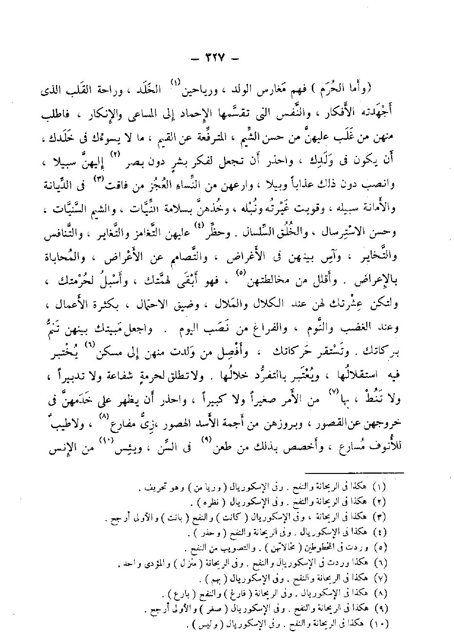 (وَأما الْحرم) فهم مغارس الْوَلَد، ورياحين الْخلد، وراحة الْقلب الَّذِي أجهدته الأفكار، وَالنَّفس الَّتِي تقسمها الإحماد إِلَى المساعي وَالْإِنْكَار، فاطلب مِنْهُنَّ من غلب عَلَيْهِنَّ من حسن الشيم، المترفعة عَن الْقيم، مَا لَا يسوءك فِي خلدك، أَن يكون فِي ولدك، وَاحْذَرْ أَن تجْعَل لفكر بشر دون بصر إلَيْهِنَّ سَبِيلا، وانصب دون ذَلِك عذَابا وبيلا، وارعهن من النِّسَاء الْعَجز من فاقت فِي الدّيانَة وَالْأَمَانَة سَبيله، وقويت غيرته ونبله، وخذهن بسلامة النيات، والشيم السنيات، وَحسن الاسترسال، والخلق السلسال. وحظر عَلَيْهِنَّ التغامز والتغاير، والتنافس والتخاير، وآس بَينهُنَّ فِي الْأَغْرَاض، والتصامم عَن الْأَعْرَاض، والمحاباة بِالْإِعْرَاضِ. وأقلل من مخالطتهن، فَهُوَ أبقى لهمتك، وأسبل لحرمتك، ولتكن عشرتك لَهُنَّ عِنْد الكلال والملال، وضيق الِاحْتِمَال، بِكَثْرَة الْأَعْمَال، وَعند الْغَضَب وَالنَّوْم، والفراغ من نصب الْيَوْم. وَاجعَل مَبِيتك بَينهُنَّ تنم بركاتك، وتستقر حركاتك، وأفصل من ولدت مِنْهُنَّ إِلَى مسكن يختبر فِيهِ استقلالها، وَيعْتَبر بالتفرد خلالها، وَلَا تطلق لحُرْمَة شَفَاعَة وَلَا تدبيرا، وَلَا تنط، بهَا من الْأَمر صَغِيرا وَلَا كَبِيرا، وَاحْذَرْ أَن يظْهر على خدمهن فِي خروجهن عَن الْقُصُور وبروزهن من أجمة الْأسد الهصور، زِيّ مفارع، ولاطيب للأنوف مسارع، وأخصص بذلك من طعن فِي السن، ويئس من الْإِنْس