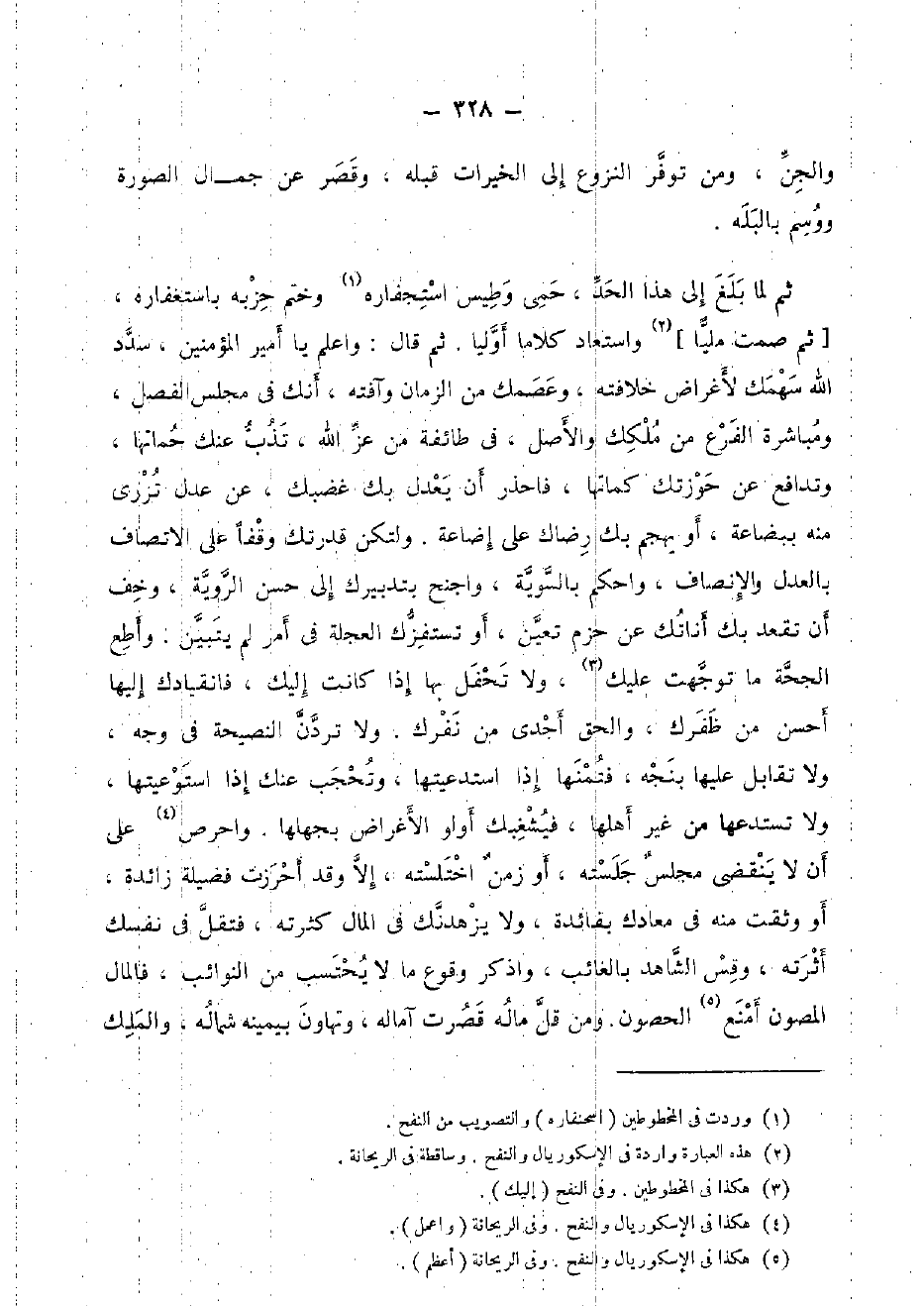 ثمَّ لما بلغ إِلَى هَذَا الْحَد، حمى وطيس استجفاره، وَختم حزبه باستغفاره، [ثمَّ صمت مَلِيًّا] واستعاد كلَاما أوليا، ثمَّ قَالَ: وَاعْلَم يَا أَمِير الْمُؤمنِينَ، سدد الله سهمك لأغراض خِلَافَته، وعصمك من الزَّمَان وآفته، أَنَّك فِي مجْلِس الْفَصْل، ومباشرة الْفَرْع من ملكك وَالْأَصْل، فِي طَائِفَة من عز الله، تذب عَنْك حماتها، وتدافع عَن حوزتك كماتها، فاحذر أَن يعدل بك غضبك، عَن عدل تزرى مِنْهُ ببضاعة، أَو يهجم بك رضاك على إِضَاعَة، ولتكن قدرتك وَقفا على الاتصاف بِالْعَدْلِ والإنصاف، واحكم بِالسَّوِيَّةِ، واجنح بتدبيرك إِلَى حسن الروية، وخف أَن تقعد بك أناتك عَن حزم تعين، أَو تستفزك العجلة فِي أَمر لم يتَبَيَّن. وأطع الْحجَّة مَا تَوَجَّهت عَلَيْك، وَلَا تحفل بهَا إِذا كَانَت إِلَيْك، فانقيادك أليها أحسن من ظفرك، وَالْحق أجدى من نفرك، وَلَا تردن النَّصِيحَة فِي وَجه، وَلَا تقَابل عَلَيْهَا بنجه، فتمنها إِذا استدعيتها، وتحجب عَنْك إِذا استوعيتها، وَلَا تستدعها من غير أَهلهَا، فيشغبك أولو الْأَغْرَاض بجهلها. واحرص على أَن لَا يَنْقَضِي مجْلِس جلسته، أَو زمن اختلسته، إِلَّا وَقد أحرزت فَضِيلَة زَائِدَة، أَو وثقت مِنْهُ فِي معادك بفائدة، وَلَا يزهدنك فِي المَال كثرته، فتقل فِي نَفسك أثرته، وَقس الشَّاهِد بالغائب، وَاذْكُر وُقُوع مَا لَا يحْتَسب من النوائب، فَالْمَال المصون أمنع الْحُصُون. وَمن قل مَاله قصرت آماله وتهاون بِيَمِينِهِ شِمَاله، وَالْملك