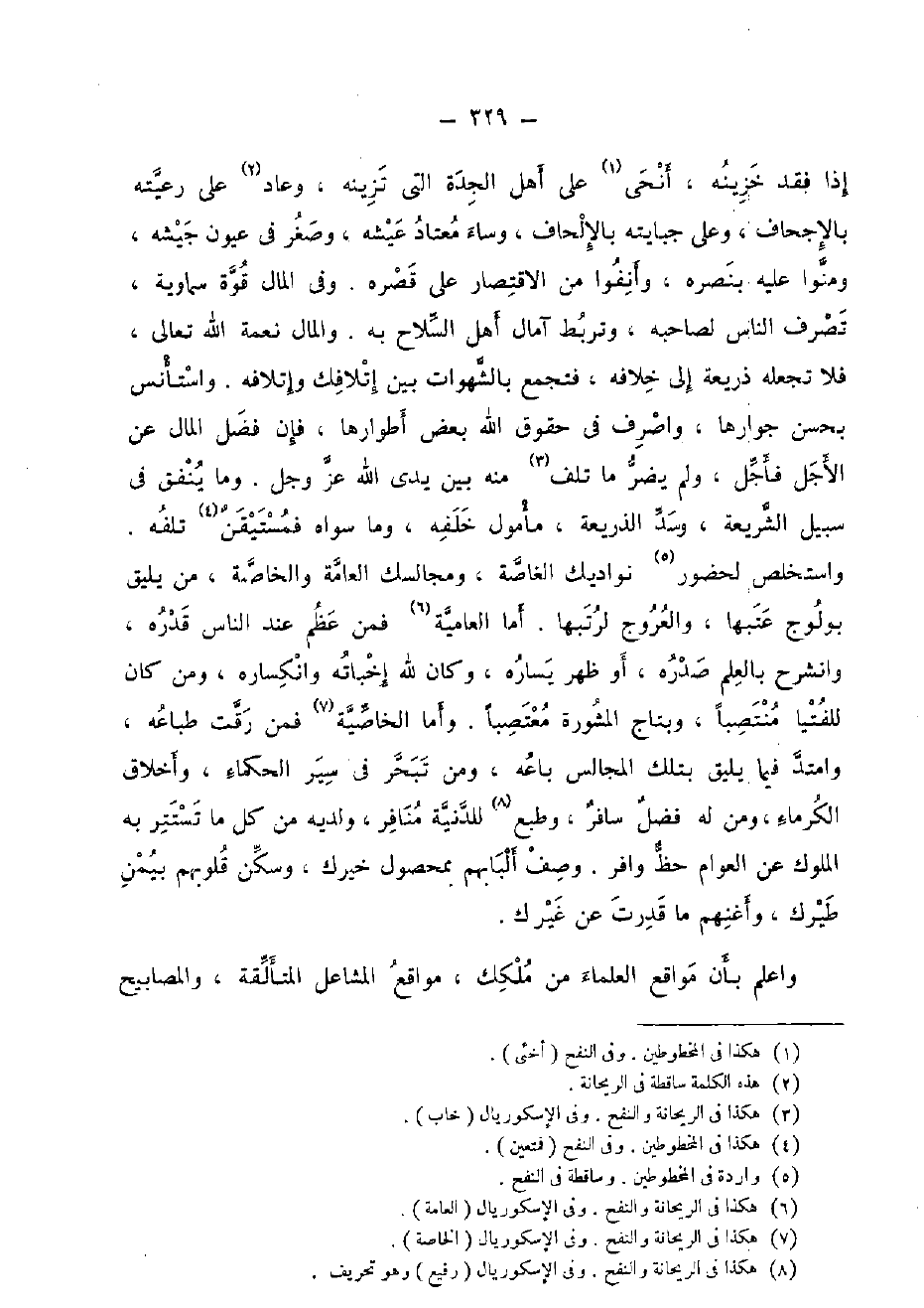 إِذا فقد خزينه، أنحى على أهل الْجدّة الَّتِي تزينه وَعَاد على رَعيته بالإجحاف، وعَلى جبايته بالإلحاف، وساء مُعْتَاد عيشه، وَصغر فِي عُيُون جَيْشه، ومنوا عَلَيْهِ بنصره، وأنفوا من الِاقْتِصَار على قصره. وَفِي المَال قُوَّة سَمَاوِيَّة، تصرف النَّاس لصَاحبه، وتربط آمال أهل السِّلَاح بِهِ. وَالْمَال نعْمَة الله تَعَالَى، فَلَا تَجْعَلهُ ذَرِيعَة إِلَى خِلَافه، فتجمع بالشهوات بَين إتلافك وإتلافه، واستأنس بِحسن جوارها، واصرف فِي حُقُوق الله بعض أطوارها، فان فضل المَال عَن الْأَجَل فأجل، وَلم يضر مَا تلف مِنْهُ بَين يَدي الله عز وَجل. وَمَا ينْفق فِي سَبِيل الشَّرِيعَة، وسد الذريعة، مأمول خَلفه، وَمَا سواهُ فمستيقن تلفه. واستخلص لحضور نواديك الغاصة، ومجالسك الْعَامَّة والخاصة، من يَلِيق بولوج عتبها، والعروج لرتبها. أما العامية فَمن عظم عِنْد النَّاس قدره، وانشرح بِالْعلمِ صَدره، أَو ظهر يسَاره، وَكَانَ لله إخباته وانكساره، وَمن كَانَ للفتيا منتصبا، وبتاج المشورة معتصبا. وَأما الخاصية فَمن رقت طباعه، وامتد فِيمَا يَلِيق بِتِلْكَ الْمجَالِس بَاعه، وَمن تبحر فِي سير الْحُكَمَاء، وأخلاق الكرماء، وَمن لَهُ فضل سَافر، وطبع للدنية منافر، ولديه من كل مَا تستتر بِهِ الْمُلُوك عَن الْعَوام حَظّ وافر. وصف ألبابهم بمحصول خيرك، وَسكن قُلُوبهم بيمن طيرك، وأغنهم مَا قدرت عَن غَيْرك ,