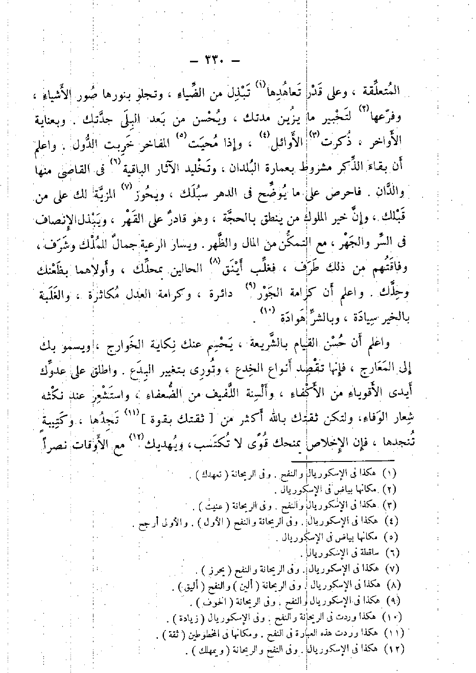 الْمُتَعَلّقَة، وعَلى قدر تعاهدها تبذل من الضياء، وتجلو بنورها صور الْأَشْيَاء، وفرعها لتحبير مَا يزين مدتك، وَيحسن من بعد البلى جدتك. وبعناية الْأَوَاخِر، ذكرت الْأَوَائِل، وَإِذا محيت المفاخر خربَتْ الدول. وَاعْلَم أَن بَقَاء الذّكر مَشْرُوط بعمارة الْبلدَانِ، وتخليد الْآثَار الْبَاقِيَة فِي القاصي مِنْهَا والدان. فاحرص على مَا يُوضح فِي الدَّهْر سبلك، ويحوز المزية لَك على من قبلك، وَإِن خير الْمُلُوك من ينْطق بِالْحجَّةِ، وَهُوَ قَادر على الْقَهْر، ويبذل الْإِنْصَاف فِي السِّرّ والجهر، مَعَ التَّمَكُّن من المَال وَالظّهْر. ويسار الرّعية جمال للْملك وَشرف، وفاقتهم من ذَلِك طرف، فغلب أينق الْحَالين بمحلك، وأولاهما بظعنك وحلك. وَاعْلَم أَن كَرَامَة الْجور دَائِرَة، وكرامة الْعدْل مكاثرة، وَالْغَلَبَة بِالْخَيرِ سيادة، وبالشر هوادة.