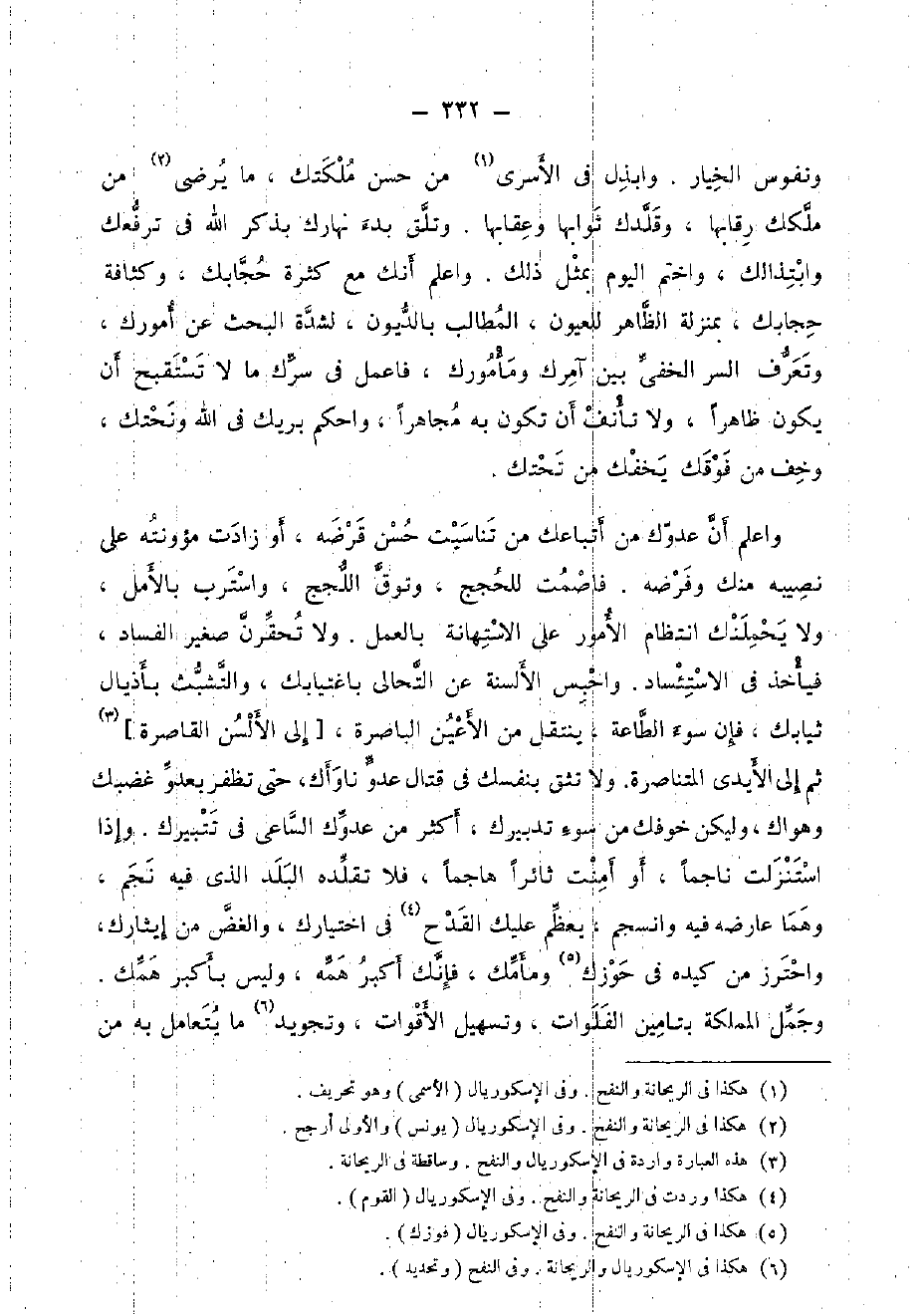 وَاعْلَم أَن عَدوك من أتباعك من تناسيت حسن قرضه، أَو زَادَت مؤونته على نصِيبه مِنْك وفرضه، فاصمت للحجج، وتوق اللجج، واسترب بالأمل، وَلَا يحملنك انتظام الْأُمُور على الاستهانة بِالْعَمَلِ. وَلَا تحقرن صَغِير الْفساد، فَيَأْخُذ فِي الاستئساد. واحبس الْأَلْسِنَة عَن التحالي باغتيابك، والتشبث بأذيال ثِيَابك، فان سوء الطَّاعَة، ينْتَقل من الْأَعْين الباصرة، [إِلَى الألسن القاصرة] ثمَّ إِلَى الْأَيْدِي المتناصرة. وَلَا تثق بِنَفْسِك فِي قتال عَدو ناوأك، حَتَّى تظفر بعدو غضبك وهواك، وَليكن خوفك من سوء تدبيرك، أَكثر من عَدوك السَّاعِي فِي تتبيرك. وَإِذا استنزلت ناجما، أَو أمنت ثائرا هاجما، فَلَا تقلده الْبَلَد الَّذِي فِيهِ نجم، وهما عَارضه فِيهِ وانسجم، يعظم عَلَيْك الْقدح فِي اختيارك، والغض من إيثارك، وَاحْترز من كَيده فِي حوزك ومأمك، فانك أكبر همه، وَلَيْسَ بأكبر همك، وجمل المملكة بتامين الفلوات وتسهيل الأقوات، وتجويد مَا يتعامل بِهِ من