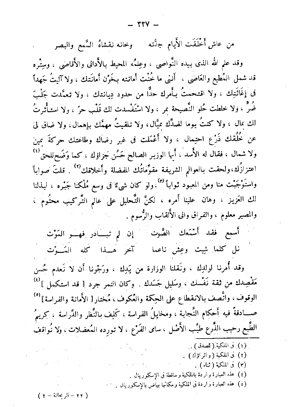 وَقد أمرنَا لولدك، ونقلنا الوزارة من يدك، ورجونا أَن لَا نعدم حسن مقصدك من ثِقَة نَفسك، وسليل جسدك. وَكَانَ النمر جرد [قد اسْتكْمل] ٍ الْوُقُوف، واتصف بالانقطاع على الْحِكْمَة والعكوف، مُخْتَار [الْأَمَانَة والفراسة] صَادِقَة فِيهِ أَحْكَام النجابة، ومخايل الفراسة، كلف بِالنّظرِ والدراسة، كريم الطَّبْع رحيب الذرع طيب الأَصْل، سامي الْفَرْع، لَا تورده المعضلات، وَلَا تواقف