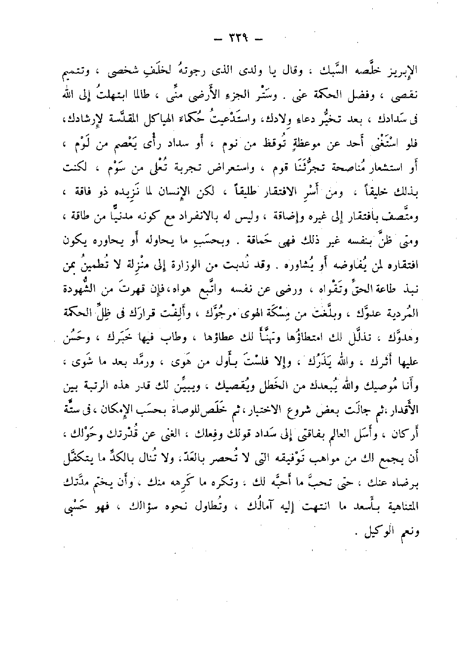 الإبريز خلصه السبك، وَقَالَ يَا وَلَدي الَّذِي رجوته لخلف شخصي، وتتميم نقصي، وَفضل الْحِكْمَة عَنى، وَستر الْجُزْء الأرضي مني، طالما ابتهلت إِلَى الله فِي سدادك، بعد تخير دُعَاء ولادك، واستدعيت حكماء الهياكل المقدسة لإرشادك، فَلَو اسْتغنى أحد عَن موعظة توقظ من نوم، أَو سداد رَأْي يعْصم من لوم، أَو استشعار مناصحة تجرثنا قوم، واستعراض تجربة تعلى من سوم، لَكُنْت بذلك خليقا، وَمن أسر الافتقار طليقا، لَكِن الْإِنْسَان لما نزيده ذُو فاقة، ومتصف بافتقار إِلَى غَيره وإضاقة، وَلَيْسَ لَهُ بالانفراد مَعَ كَونه مدنيا من طَاقَة، وَمَتى ظن بِنَفسِهِ غير ذَلِك فَهِيَ حَمَاقَة. وبحسب مَا يحاوله أَو يحاوره يكون افتقاره لمن يفاوضه أَو يشاوره. وَقد ندبت من الوزارة إِلَى منزلَة لَا تطمين بِمن نبذ طَاعَة الْحق وتقواه، وَرَضي عَن نَفسه وَاتبع هَوَاهُ، فان قهرت من الشهودة المردية عَدوك، وَبَلغت من مسكة الْهوى مرجوك، وألفت قرارك فِي ظلّ الْحِكْمَة وهدوك، تذلل لَك امتطاؤها وَتَهْنَأ لَك عطاؤها، وطاب فِيهَا خبرك، وَحسن عَلَيْهَا أثرك، وَالله يذرك، وَإِلَّا فلست بِأول من هوى، ورمد بعد مَا شوى، وَأَنا مُوصِيك وَالله يبعدك، من الخطل ويقصيك، وَيبين لَك قدر هَذِه الرُّتْبَة بَين الأقدار، ثمَّ جالت بعض شُرُوع الِاخْتِيَار ثمَّ خلص للوصاة بِحَسب الْإِمْكَان، فِي سِتَّة أَرْكَان، وأسل الْعَالم بفاقتي إِلَى سداد قَوْلك وفعلك، الْغنى عَن قدرتك وحولك، أَن يجمع لَك من مواهب توفيقه الَّتِي لَا تحصر بالعد وَلَا تنَال بالكد مَا يتكفل بِرِضَاهُ عَنْك، حَتَّى تحب مَا أحبه لَك، وَتكره ماكرهه مِنْك، وَأَن يخْتم مدتك المتناهية بِأَسْعَد مَا انْتَهَت إِلَيْهِ آمالك، وتطاول نَحوه سؤالك، فَهُوَ حسبي وَنعم الْوَكِيل.