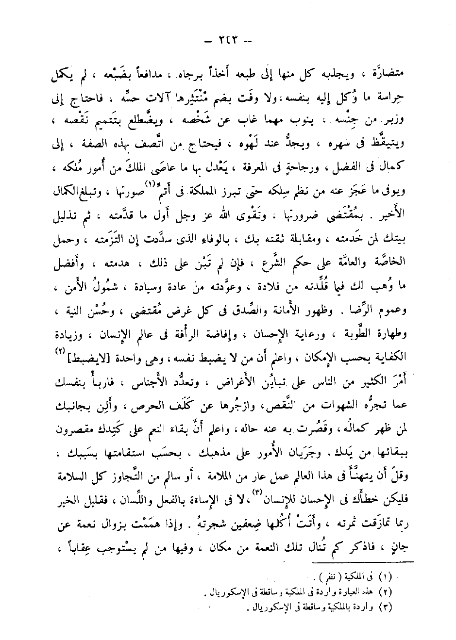 متضارة، ويجذبه كل مِنْهَا إِلَى طبعه أخذا برجاه، مدافعا بضبعه، لم يكمل حراسة مَا وكل إِلَيْهِ، وَلَا وفت بِضَم منتثرها آلَات حسه، فَاحْتَاجَ إِلَى وَزِير من جنسه، يَنُوب مهما غَابَ عَن شخصه، ويضطلع بتتميم نَقصه، ويتيقظ فِي سهره، ويجد عِنْد لهوه، فَيحْتَاج من اتّصف بِهَذِهِ الصّفة، إِلَى كَمَال فِي الْفضل، ورجاحة فِي الْمعرفَة، يعدل بهَا مَا عاصى الْملك من أُمُور ملكه ويوفي مَا عجز عَنهُ من نظم سلكه حَتَّى تبرز المملكة فِي أتم صورتهَا، وتبلغ الْكَمَال الْأَخير. بِمُقْتَضى ضرورتها، وتقوى الله عز وَجل أول مَا قَدمته، ثمَّ تذليل بَيْتك لمن خدمته، ومقابلة ثقته بك، بِالْوَفَاءِ الذى سددت إِن التزمته، وَحمل الْخَاصَّة والعامة على حكم الشَّرْع، فَإِن لم تبن على ذَلِك، هدمته، وَأفضل مَا وهب لَك فِيمَا قلدته من قلادة، وعودته من عَادَة وسيادة، شُمُول الْأَمْن، وَعُمُوم الرِّضَا. وَظُهُور الْأَمَانَة والصدق فِي كل غَرَض مُقْتَضى، وَحسن النِّيَّة، وطهارة الطوبة، ورعاية الْإِحْسَان، وإفاضة الرأفة فِي عَالم الْإِنْسَان، وَزِيَادَة الْكِفَايَة بِحَسب الْإِمْكَان، وَاعْلَم أَن من لَا يضْبط نَفسه، وَهِي وَاحِدَة [لَا يضْبط] أَمر الْكثير من النَّاس على تبَاين الْأَغْرَاض، وتعدد الْأَجْنَاس، فاربأ بِنَفْسِك عَمَّا تجره الشَّهَوَات من النَّقْص، وازجرها عَن كلف الْحِرْص، وألن يجانبك لمن ظهر كَمَاله، وَقصرت بِهِ عَنهُ حَاله، وَاعْلَم أَن بَقَاء النعم على كتدك مقصرون ببقائها من يدك، وجريان الْأُمُور على مذهبك، بِحَسب استقامتها بسببك، وَقل أَن يتهنأ فِي هَذَا الْعَالم عمل عَار من الْمَلَامَة أَو سَالم من التجاوز كل السَّلامَة فَلْيَكُن خطأك فِي الْإِحْسَان للْإنْسَان، لَا فِي الْإِسَاءَة بِالْفِعْلِ وَاللِّسَان، فقليل الْخَيْر رُبمَا تمازقت ثَمَرَته، وَأَتَتْ أكلهَا ضعفين شجرته. وَإِذا هَمَمْت بِزَوَال نعْمَة عَن جَان، فاذكر كم تنَال تِلْكَ النِّعْمَة من مَكَان، وفيهَا من لم يسْتَوْجب عقَابا،