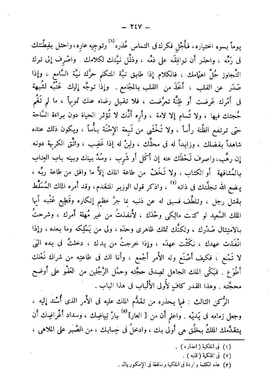 الرُّكْن الثَّالِث: فِيمَا يحذرهُ من تقدم الْملك عَلَيْهِ فِي الْأَمر الَّذِي أسْند إِلَيْهِ، وَجعل زمامه فِي يَدَيْهِ. وَاعْلَم أَن من [الْعَار] بارتياضك، وسداد أغراضك أَن يتقدمك الْملك بِخلق هِيَ أولى بك، وادخل فِي حِسَابك، من الصَّبْر على الملاهي،
