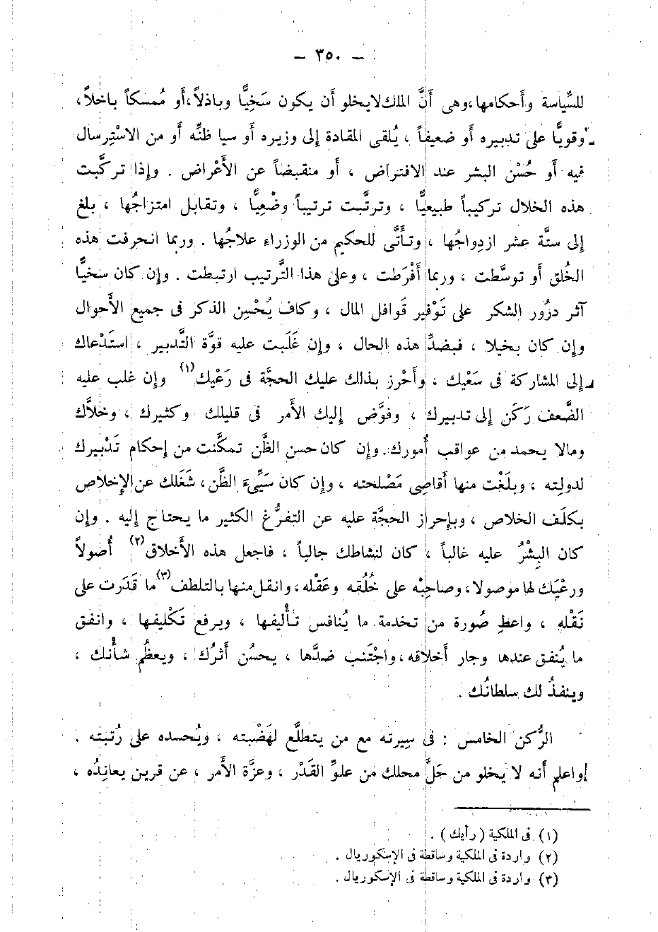 للسياسة وأحكامها، وَهِي أَن الْملك لَا يَخْلُو أَن يكون سخيا وباذلا، أَو ممسكا باخلا، وقويا على تَدْبيره أَو ضَعِيفا، يلقى المقادة إِلَى وزيره أَو سيا ظَنّه أَو من الاسترسال فِيهِ أَو حسن الْبشر عِنْد الافتراض، أَو منقبضا عَن الْأَعْرَاض. وَإِذا تركبت هَذِه الْخلال تركيبا طبيعيا، وترتبت ترتيبا وضعيا، وتقابل امتزاجها، بلغ إِلَى سِتَّة عشر ازدواجها، وَتَأْتِي للحكيم من الوزراء علاجها، وَرُبمَا انحرفت هَذِه الْخلق أَو توسطت، وَرُبمَا أفرطت، وعَلى هَذَا التَّرْتِيب ارتبطت، وَإِن كَانَ سخيا آثر درور الشُّكْر على توفير قوافل المَال، وكاف يحسن الذّكر فِي جَمِيع الْأَحْوَال وَإِن كَانَ بَخِيلًا، فبضد هَذِه الْحَال، وَإِن غلبت عَلَيْهِ قُوَّة التَّدْبِير، استدعاك إِلَى الْمُشَاركَة فِي سعيك، وأحرز بذلك عَلَيْك الْحجَّة فِي رعيك وَإِن غلب عَلَيْهِ الضعْف ركن إِلَى تدبيرك، وفوض إِلَيْك الْأَمر فِي قليلك وكثيرك، وخلاك ومالا يحمد من عواقب أمورك، وَإِن كَانَ حسن الظَّن تمكنت من إحكام تدبيرك لدولته، وَبَلغت مِنْهَا أقاصي مصْلحَته، وَإِن كَانَ سيء الظَّن، شغلك عَن الْإِخْلَاص بكلف الْخَلَاص، وبإحراز الْحجَّة عَلَيْهِ عَن التفرغ الْكثير مَا يحْتَاج إِلَيْهِ، وَإِن كَانَ الْبشر عَلَيْهِ غَالِبا، كَانَ لنشاطك جالبا، فَاجْعَلْ هَذِه الْأَخْلَاق أصولا ورعيك لَهَا موصلوا، وَصَاحبه على خلقه وعقله، وانقل مِنْهَا بالتلطف مَا قدرت على نَقله، واعط صُورَة من تخدمة مَا ينافس تأليفها، وَيرْفَع تكليفها، وانفق مَا ينْفق عِنْدهَا وجار أخلاقه، واجتنب ضدها، يحسن أثرك، ويعظم شَأْنك، وَينفذ لَك سلطانك.