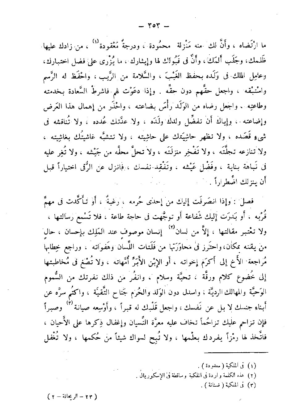 فصل: وَإِذا انصرفت إِلَيْك من إِحْدَى حرمه، رَغْبَة، أَو تأكدت فِي مُهِمّ قربه، أَو بدرت إِلَيْك شَفَاعَة أَو تَوَجَّهت فِي حَاجَة طَاعَة، فَلَا تسمع رسالتها، وَلَا تعْتَبر مقالتها، إِلَّا من لِسَان إِنْسَان مَوْصُوف عِنْد الْملك بِإِحْسَان، حَال من يقنه بمَكَان، وَاحْترز فِي محاورتها من فلتات اللِّسَان وهفواته، وراجع خطابها مُرَاجعَة الْأَخ إِلَى أكْرم إخواته، أَو الإبن الأبر أمهاته. وَلَا تصغ فِي مخاطبتها إِلَى خضوع كَلَام ورقة، تَحِيَّة وَسَلام، وانفر من ذَلِك نفرتك من السمُوم الوحية والمهالك الردية، واسدل دون الْوَلَد وَالْحرم جنَاح التقية، واكتم سره عَن أَبنَاء جنسك لَا بل عَن نَفسك وَاجعَل قَلْبك لَهُ قبرا، وأوسعه صِيَانة وصبرا فَإِن تزاحم عَلَيْك تزاحما تخَاف عَلَيْهِ معرة النسْيَان وإغفال ذكرهَا على الأحيان، فَاتخذ لَهَا رمزا يفردك بعلمها، وَلَا تبح لسواك شَيْئا من حكمهَا، وَلَا تغفل