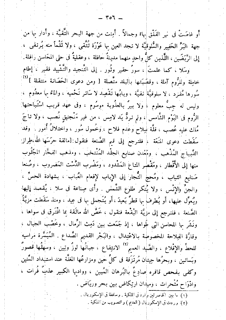 أَو غاصت فِي نهر الفلق بهاء وجمالا، أمنت من جِهَة الْبَحْر التقية، وأدار بهَا من جِهَة الْبر الحفير والسلوقية لَا تَجِد الْعين بهَا عَورَة تتقى، وَلَا ثلمًا مِنْهُ يرتقي، إِلَى الربضين، اللَّذين كل وَاحِد مِنْهُمَا مَدِينَة حافلة، وعقلية فِي حلى المحاسن رافلة، وسلا، كَمَا علمت، سور حقير وثور. إِلَى التنجيد والتشييد فَقير، إطام خاملة وللروم آملة، وقصبتها بِالْبَلَدِ مُتَّصِلَة [وَمن دَعْوَى الحصانة منتقلة] سورها مُفْرد، لَا سلوقية نقية، وبابها تقصد لَا سَاتِر تحميه وَالْمَاء بهَا مَعْدُوم وَلَيْسَ لَهُ جب مَعْلُوم، وَلَا بير بالعذوبة مَوْسُوم، وَفِي عهد قريب استباحتها الرّوم فِي الْيَوْم الشامس، وَلم ترد يَد لامس، من غير منجنيق نصب، وَلَا تَاج ملك عَلَيْهِ عصب، قلَّة سلَاح وَعدم فلاح، وخمول سور، واختلال أُمُور. وَقد سَقَطت دَعْوَى المنعة، فَلْتَرْجِعْ إِلَى قيم الصَّنْعَة فَنَقُول: [مالقة حرسها الله، طراز الديباج الْمَذْهَب، ومعدن صنايع الْجلد الْمُنْتَخب، وَمذهب الفخار المجلوب مِنْهَا إِلَى الأقطار، ومقصر الْمَتَاع المشدود، ومضرب الدست الْمَضْرُوب، وصنعا صنايع الثِّيَاب، ومحج التُّجَّار إِلَى الإياب لإفعام الْعباب، بِشَهَادَة الْحس، وَالْجِنّ وَالْإِنْس، وَلَا يُنكر طُلُوع الشَّمْس، وَأي صناعَة فِي سلا، يقْصد إِلَيْهَا ويعول عَلَيْهَا، أَو يطرف بهَا قطر بعيد أَو يتجمل بهَا فِي عيد، ومنذ سَقَطت مزية الصَّنْعَة، فلنرجع إِلَى مزية الْبقْعَة فَنَقُول، خص الله مالقة بِمَا افترق فِي سواهَا وَنشر بهَا المحاسن الَّتِي طواها، إِذْ جمعت بَين دمث الرمال، وخصب الْجبَال، وقارة الفلاحة الْمَخْصُوصَة بالاعتدال، وَالْبَحْر الْقَدِيم الصداع الميسرة مراسيه للحط والإقلاع، وَالصَّيْد العميم الِانْتِفَاع، جبالها لوز وتين، وسهلها قُصُور وبساتين، وبحرها حيتان مرتزقة فِي كل حِين ومزارعها المغلة عِنْد استبداد السنين وَكفى بفحص قافره صادع بالبرهان الْمُبين، وواديها الْكَبِير عذب فرات، وادواح مثحرات، وميدان ارتكاض بَين بَحر ورياض