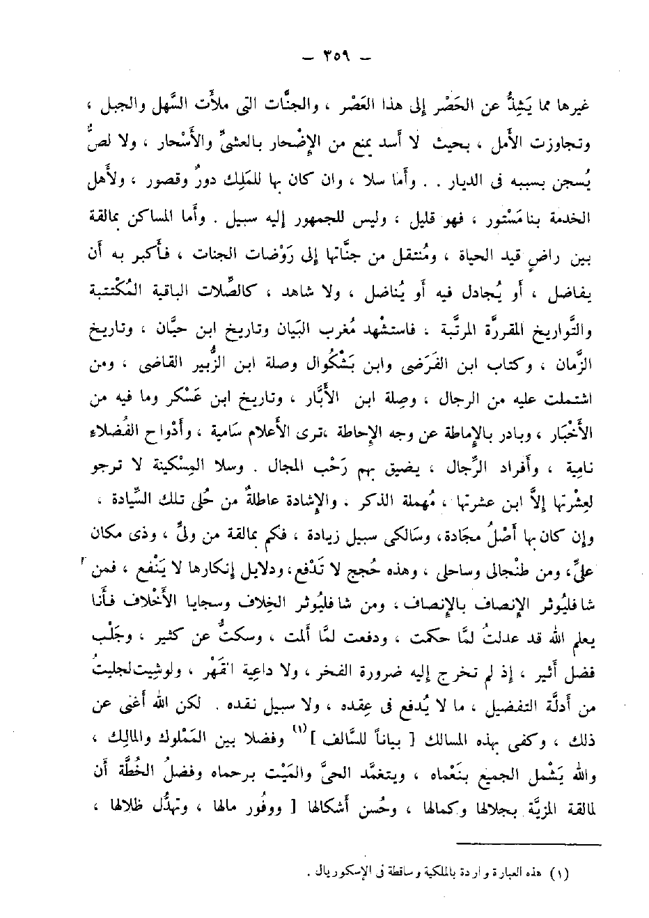 غَيرهَا مِمَّا يشذ عَن الْحصْر إِلَى هَذَا الْعَصْر، والجنات الَّتِي مَلَأت السهل والجبل، وتجاوزت الأمل، بِحَيْثُ لَا أَسد يمْنَع من الإضحار بالعشى والأسحار، وَلَا لص يسجن بِسَبَبِهِ فِي الديار. . وَأما سلا، وان كَانَ بهَا للْملك دور وقصور، وَلأَهل الْخدمَة بِنَا مَسْتُور، فَهُوَ قَلِيل، وَلَيْسَ لِلْجُمْهُورِ إِلَيْهِ سَبِيل. وَأما المساكن بمالقة بَين رَاض قيد الْحَيَاة، ومنتقل من جناتها إِلَى روضات الجنات، فأكبر بِهِ أَن يفاضل، أَو يُجَادِل فِيهِ أَو يناضل، وَلَا شَاهد، كالصلات الْبَاقِيَة المكتتبة والتواريخ المقررة الْمرتبَة، فاستشهد مغرب الْبَيَان وتاريخ ابْن حَيَّان، وتاريخ الزَّمَان، وَكتاب ابْن الفرضي وَابْن بشكوال وصلَة ابْن الزبير القَاضِي، وَمن اشْتَمَلت عَلَيْهِ من الرِّجَال، وصلَة ابْن الْأَبَّار، وتاريخ ابْن عَسْكَر وَمَا فِيهِ من الْأَخْبَار، وبادر بالإماطة عَن وَجه الْإِحَاطَة، ترى الْأَعْلَام سامية، وأدواح الْفُضَلَاء نامية، وأفراد الرِّجَال، يضيق بهم رحب المجال، وسلا المسكينة لَا ترجو لعشرتها إِلَّا ابْن عشرتها، مُهْملَة الذّكر، والإشادة عاطلة من حلى تِلْكَ السِّيَادَة، وَإِن كَانَ بهَا أصل مجادة، وسالكي سَبِيل زِيَادَة، فكم بمالقة من ولي، وَذي مَكَان على، وَمن طنجالي وساحلي، وَهَذِه حجج لَا تدفع، ودلايل إنكارها لَا ينفع، فَمن شا فليوثر الْإِنْصَاف بالإنصاف، وَمن شا فليوثر الْخلاف وسجايا الأخلاف فَأَنا يعلم الله قد عدلت لما حكمت، وَدفعت لما ألمت، وَسكت عَن كثير، وجلب فضل أثير، إِذْ لم تخرج إِلَيْهِ ضَرُورَة الْفَخر، وَلَا دَاعِيَة الْقَهْر، وَلَو شيت لجليت من أَدِلَّة التَّفْضِيل، مَا لَا يدْفع فِي عقده، وَلَا سَبِيل نَقده، لَكِن الله أغْنى عَن ذَلِك، وَكفى بِهَذِهِ المسالك [بَيَانا للسالف] وفضلا بَين الْمَمْلُوك وَالْمَالِك، وَالله يَشْمَل الْجَمِيع بنعماه، ويتغمد الْحَيّ وَالْمَيِّت برحماه وَفضل الخطة أَن لمالقة المزية بجلالها وكمالها، وَحسن أشكالها [ووفور مَالهَا، وتهدل ظلالها،