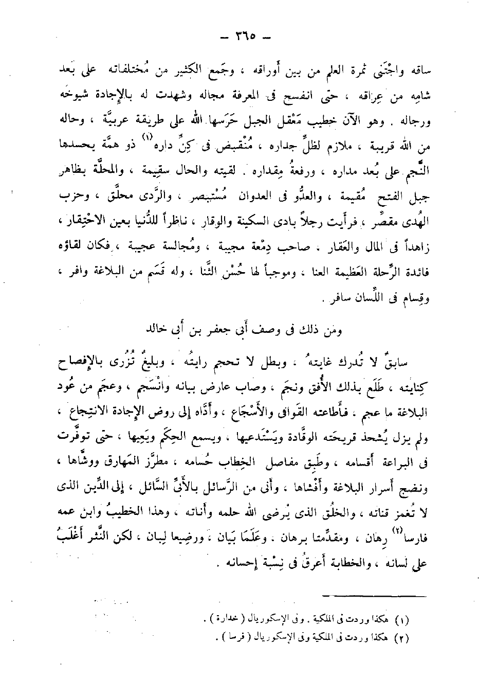 سَابق لَا تدْرك غَايَته، وَبَطل لَا تحجم رايته، وبليغ تزرى بالإفصاح كنايته،، طلع بذلك الْأُفق وَنجم، وصاب عَارض بَيَانه وانسجم، وعجم من عود البلاغة مَا عجم، فأطاعته القوافي والأسجاع، وَأَدَّاهُ إِلَى روض الإجادة الانتجاع، وَلم يزل يشحذ قريحته الوقادة ويستدعيها، وَيسمع الحكم ويعيها حَتَّى توفرت فِي البراعة أقسامه، وطبق مفاصل الْخطاب حسامه، مطرز المهارق ووشاها، ونضج أسرار البلاغة وأفشاها، وأنى من الرسائل بالأبى السَّائِل، إِلَى الدّين الَّذِي لَا تغمز قناته، والخلق الَّذِي يرضى الله حلمه وأناته، وَهَذَا الْخَطِيب وَابْن عَمه فَارِسًا رهان، ومقدمتا برهَان، وعلما بَيَان، ورضيعا لبان، لَكِن النثر أغلب على لِسَانه، والخطابة أعرق فِي نِسْبَة إحسانه.