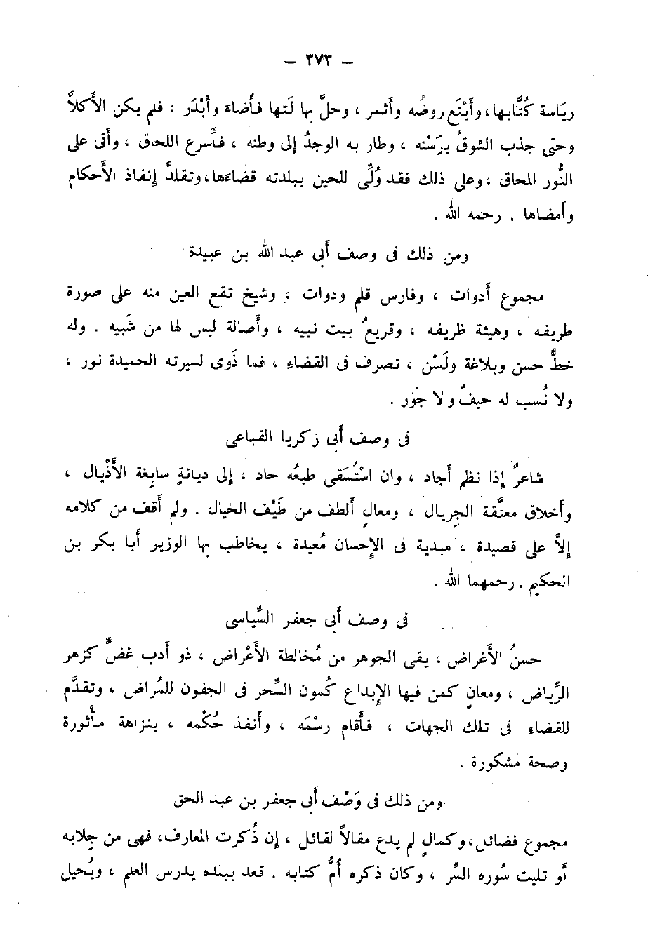 حسن الْأَغْرَاض، يقي الْجَوْهَر من مُخَالطَة الْأَعْرَاض، ذُو أدب غض كزهر الرياض، وَمَعَان كمن فِيهَا الإبداع كمون السحر فِي الجفون للمراض، وَتقدم للْقَضَاء فِي تِلْكَ الْجِهَات، فَأَقَامَ رسمه، وأنفذ حكمه، بنزاهة مأثورة وَصِحَّة مشكورة.