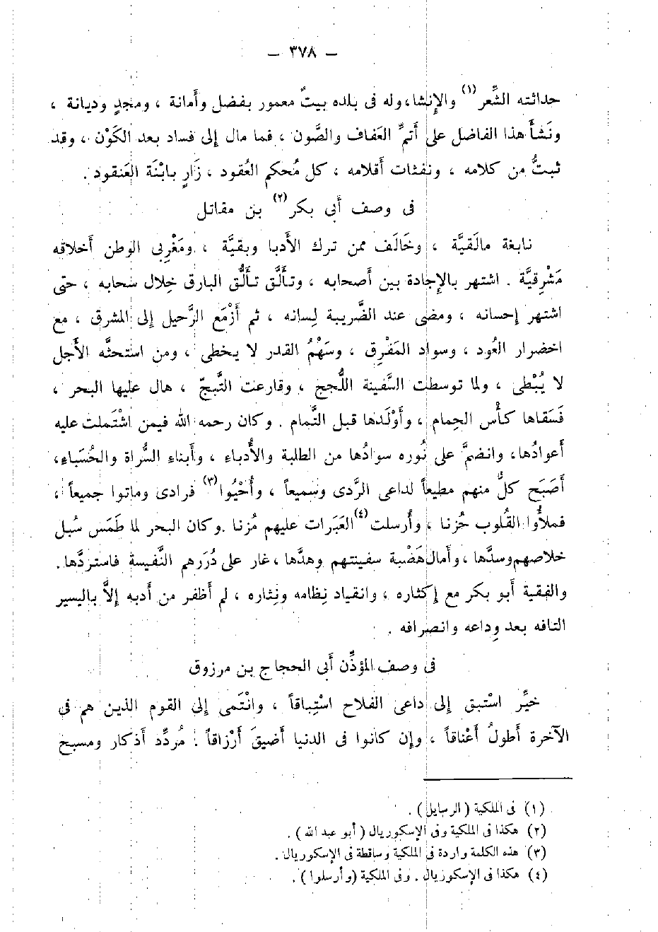فِي وصف أبي بكر بن مقَاتل نَابِغَة مالقية، وَخَالف مِمَّن ترك الأدبا وَبَقِيَّة، ومغربي الوطن أخلاقه مشرقية. اشْتهر بالإجادة بَين أَصْحَابه، وتألق تألق البارق خلال سحابه، حَتَّى اشْتهر إحسانه، وَمضى عِنْد الضريبة لِسَانه، ثمَّ أزمع الرحيل إِلَى الْمشرق، مَعَ اخضرار الْعود، وَسَوَاد المفرق، وَسَهْم الْقدر لَا يخطى، وَمن استحثه الْأَجَل لَا يبطى، وَلما توسطت السَّفِينَة اللجج، وقارعت التبج، هال عَلَيْهَا الْبَحْر، فَسَقَاهَا كأس الْحمام، وأولدها قبل التَّمام، وَكَانَ رَحمَه الله فِيمَن اشْتَمَلت عَلَيْهِ أعوادها، وانضم على نوره سوادها من الطّلبَة والأدباء، وَأَبْنَاء السراة والحسباء، أصبح كل مِنْهُم مُطيعًا لداعى الردى وسميعا، وأحيوا فُرَادَى وماتوا جَمِيعًا، فملأوا الْقُلُوب حزنا، وَأرْسلت العبرات عَلَيْهِم مزنا. وَكَانَ الْبَحْر لما طمس سبل خلاصهم وسدها، وأمال هضبة سفينتهم وهدها، غَار على دررهم النفيسة فاستردها. والفقية أَبُو بكر مَعَ إكثاره، وانقياد نظامه ونثاره، لم أظفر من أدبه إِلَّا باليسير التافه بعد وداعه وانصرافه.