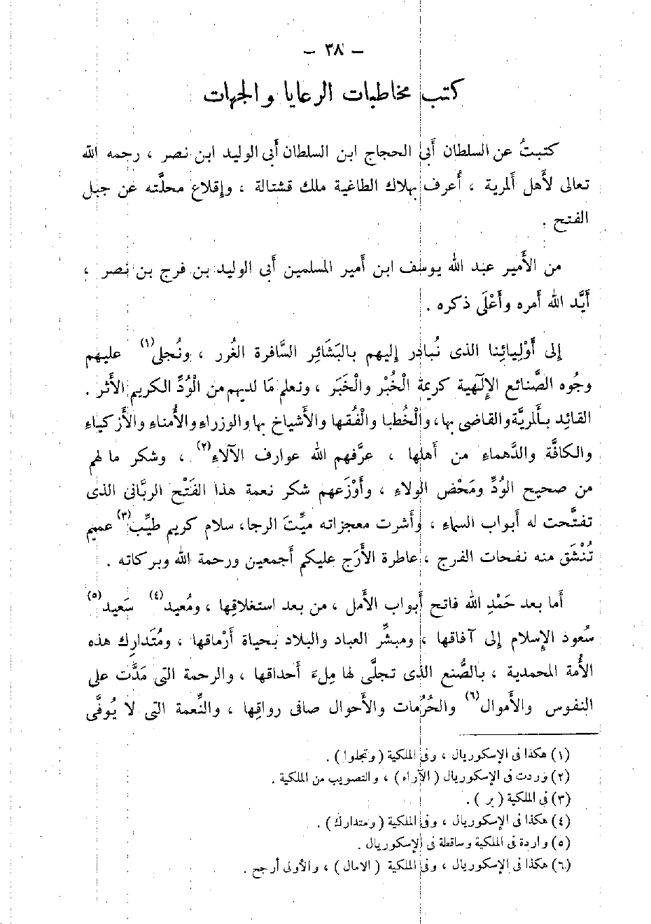 إِلَى أوليائنا الَّذِي نبادر إِلَيْهِم بالبشائر السافرة الْغرَر، ونجلي عَلَيْهِم وُجُوه الصَّنَائِع الإلهية كَرِيمَة الْخَبَر وَالْخَبَر، ونعلم مَا لديهم من الود الْكَرِيم الْأَثر. الْقَائِد بألمرية وَالْقَاضِي بهَا، والخطبا والفقها والأشياخ بهَا والوزراء والأمناء والأزكياء والكافة والدهماء من أَهلهَا، عرفهم الله عوارف الآلاء، وشكر مَا لَهُم من صَحِيح الود ومحض الْوَلَاء، وأوزعهم شكر نعْمَة هَذَا الْفَتْح الرباني الَّذِي تفتحت لَهُ أَبْوَاب السَّمَاء، وأشرت معجزاته ميت الرجا، سَلام كريم طيب عميم تَنْشَق مِنْهُ نفحات الْفرج، عاطرة الأرج عَلَيْكُم أَجْمَعِينَ وَرَحْمَة الله وَبَرَكَاته.